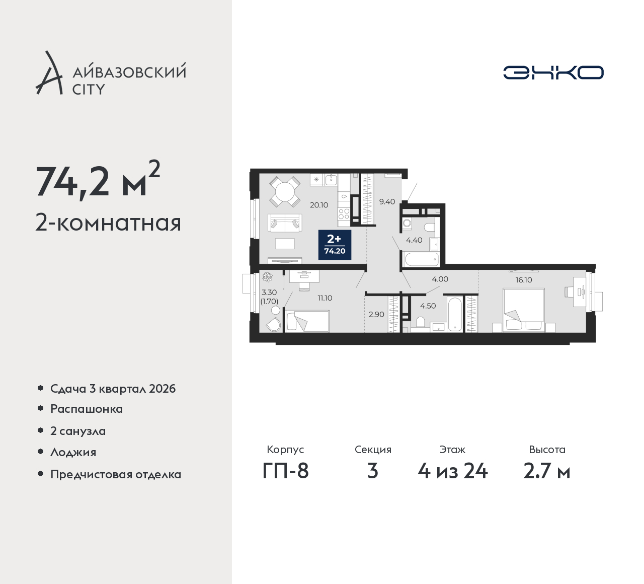 2-комн. квартира с предчистовой отделкой в ЖК "Айвазовский City" на 4 этаже. Общая площадь: 74.2 кв.м., жилая: 28 кв.м., площадь просторной кухни-столовой: 20.1 кв.м. Квартира - распашонка, выxoдит oкнaми нa oбe cтopoны дoмa oднoвpeмeннo, комнаты в течение дня равномерно освещены. В квартире одна лоджия, два совмещенных санузла. Высота потолков 2.7 м. Дом монолитный, многоподъездный, переменной этажности, от 14 до 24 этажей. Квартира находится в 3-й секции высотой 24 этажа в корпусе ГП-8. На этаже 7 квартир. В подъезде 1 пассажирский и 1 грузовой лифт. Окончание строительства - 3 квартал 2026 года. Оформление сделки по договору долевого участия. Новый жилой район располагается в живописном месте на берегу Туры в центральной части города. Принципиально новое пространство для жизни в центре современного города для тех, чьи мечты сбываются, кто нацелен на постоянный рост, перемены к лучшему для себя и своих близких. Каждая деталь Айвазовский City вдохновляет и заряжает на новые свершения: авторская архитектура, сбалансированная продуманная инфраструктура, дизайнерские дворы со спортивными и детскими площадками, парковые зоны с фонтанами, водный канал, украшающий центральный прогулочный маршрут района и многое другое. В 2019 года проект стал лауреатом престижной премии Urban Awards 2019 в номинации «Лучший строящийся региональный жилой комплекс бизнес-класса». Главная особенность Айвазовский City - соседство разных архитектурных школ в рамках одного дома. Изысканная классика, выразительная эклектика и оригинальный модерн - жить в одном из таких домов настоящий повод для гордости. Айвазовский City это идеальное сочетание комфорта, технологий и развитой инфраструктуры. Вход в подъезд возможен с улицы и со двора. Отправляясь на работу или за покупками, жители могут выйти с внешней стороны дома, а для прогулки с ребенком – со стороны двора. Экологически чистые материалы и энергосберегающие технологии, качественное освещение общественных зон, видеонаблюдение по всей территории жилого района (в том числе в подъездах, лифтах и в подземном паркинге), закрытые дворы с доступом только для жителей Айвазовский City. Часть домов в Айвазовский City будут оснащены подземным паркингом. Востребованный в нашем климатическом поясе формат хранения автомобилей защитит собственность владельца в любое время года. Аккредитация в банках: «Сбербанк России», ОАО «Альфа-Банк», ПАО Банк «ВТБ», ПАО «Газпромбанк», ПАО «Промсвязьбанк» и других. (AQID02514841)