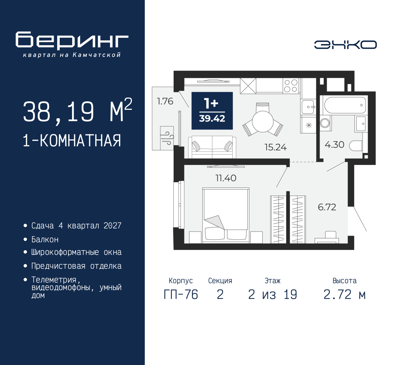 - Общая площадь 38.19 м²