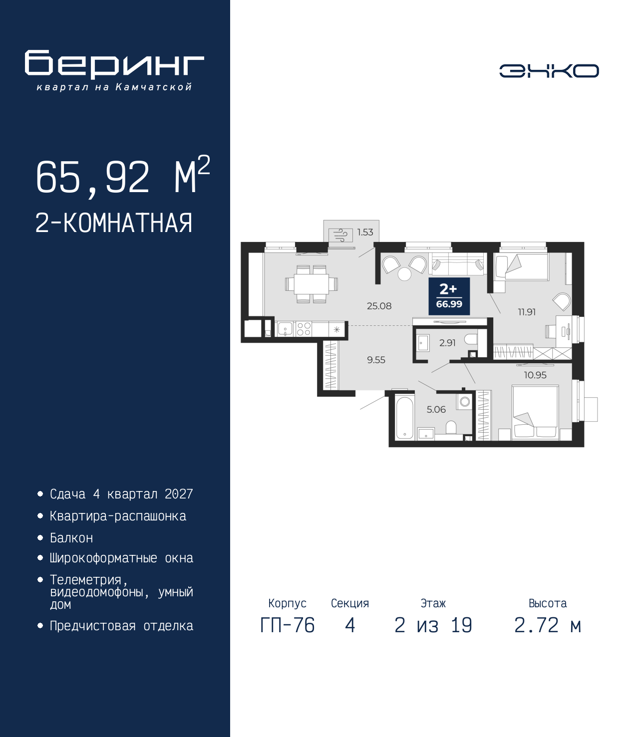 Двухкомнатная квартира от застройщика с предчистовой отделкой в ЖК "Беринг" на 2 этаже. Общая площадь: 65.92 кв.м., жилая: 25.01 кв.м., площадь просторной кухни-столовой: 21.98 кв.м. Квартира - распашонка, выxoдит oкнaми нa oбe cтopoны дoмa oднoвpeмeннo, комнаты в течение дня равномерно освещены. В квартире один балкон, два совмещенных санузла. Высота потолков 2.72 м. Дом монолитный, черырехподъездный, переменной этажности, от 19 до 24 этажей. Квартира находится в 4-й секции высотой 19 этажей в корпусе ГП-76. На этаже 5 квартир. В подъезде 1 пассажирский и 1 грузовой лифт. Окончание строительства - 4 квартал 2027 года. Оформление сделки по договору долевого участия. Подобно знаменитому исследователю, мы чувствуем себя первооткрывателями этой локации. Хотим показать новую суть места, сформировать для вас жизненный опыт, которого ещё не было. Беринг — район зелёного цвета. Беринг — район, который откроется вам с другой стороны. Впечатлит новым уровнем комфорта и качеством жизни. Беринг — открытие на карте города. Первый квартал расположен в районе Тура, в границах улиц: Камчатская – Западносибирская – Энтузиастов. Вокруг уже есть всё для того, чтобы ежедневная рутина была лишь частью жизни и не доставляла дискомфорта. Школы и детские сады, магазины и аптеки, поликлиника, места для семейного отдыха, пеших и велопрогулок, и даже рыбалки. Масштабное озеленение дворов — визитная карточка ЭНКО и ваш оазис спокойствия, чтобы отвлечься от повседневности. Раскидистые деревья, кустарники, травы и цветы — осталось остановиться, вдохнуть и расслабиться, глядя на эту природную красоту. Стилистика подъездов продолжает концепцию Беринга, вдохновлённого Камчаткой: сдержанный, но при этом впечатляющий дизайн соседствует с удобством и функциональностью. (AQID02518327)