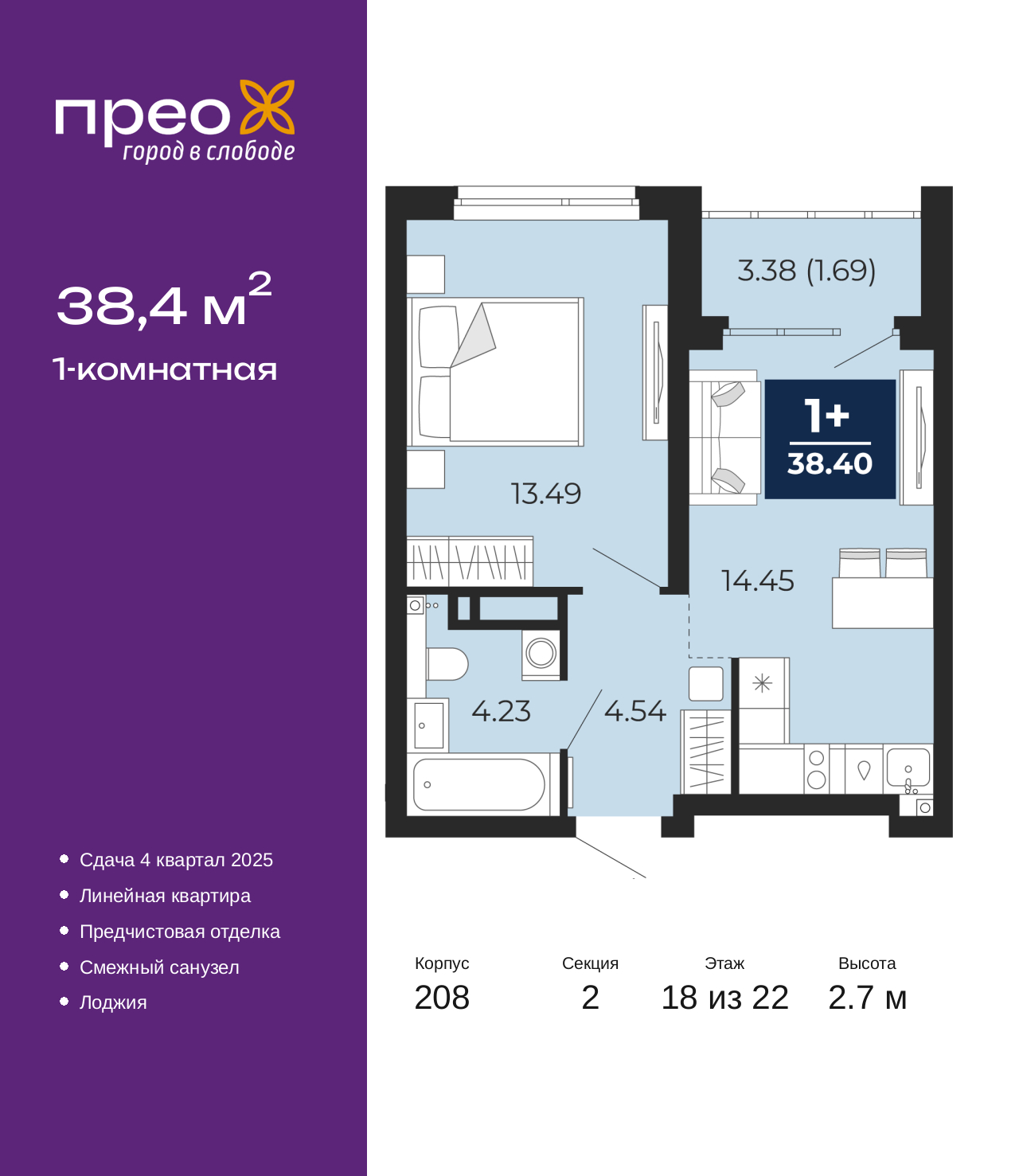 Просторная 1-комн. квартира с предчистовой отделкой в ЖК "Прео" на 18 этаже. Общая площадь: 38.4 кв.м., жилая: 13.49 кв.м., площадь просторной кухни-столовой: 14.45 кв.м. Все окна выходят на одну сторону. В квартире одна лоджия, один совмещенный санузел. Высота потолков 2.7 м. Дом монолитный, трехподъездный, переменной этажности, от 14 до 22 этажей. Квартира находится во 2-й секции высотой 22 этажа в корпусе 208. На этаже 10 квартир. В подъезде 1 пассажирский и 1 грузовой лифт. Окончание строительства - 1 квартал 2026 года. Оформление сделки по договору долевого участия. Преображенский — один из самых привлекательных районов для жизни! Это полностью самостоятельный жилой район с точки зрения инфраструктуры. Преображенский находится между Московским и Червишевским трактами в квартале улиц Закалужская — Вьюжная — Александра Протозанова. Не нужно ждать, когда появится инфраструктура — переезжайте на всё готовое. Вблизи расположены действующие школа и детский сад. В этом году откроется еще один сад, а в следующем году — школа. По соседству с Преображенским запланировано строительство городского парка «Комарово» площадью 38 гектар. За 10 минут можно доехать на автомобиле до крупных ТРЦ: «Лента», «Кристалл», «Леруа Мерлен», «Метро» и «Ашан». С 2018 года в районе открыт Соседский центр — пространство, созданное для формирования добрососедской среды, совместного досуга, общения и реализации соседских инициатив. Здесь проходят встречи соседей, а также сами жители района организовывают мероприятия. Организатором такого события может стать любой желающий. В квартирах выполнена качественная предчистовая отделка. Гладкие стены с финишным выравниванием по маякам. Ровный потолок для установки натяжного потолка. Установлены пятикамерные окна с двойным стеклопакетом (3 стекла). Дизайнерские холлы с видеонаблюдением, безбарьерным и прозрачным входом – всегда светло и спокойно. На первом этаже есть просторные колясочные, где все жители могут оставлять свои коляски и велосипеды. В Преображенском есть всё, что нужно для активного отдыха и занятий спортом. Мы сделали большое футбольное поле с безопасным покрытием. Также установили хоккейный корт, который оборудован по всем необходимым стандартам. Во дворах можно делать упражнения на специальных площадках с турниками. Весь район мы обустроили велодорожками, которые связаны в единый маршрут. У нас есть сухие фонтаны, бьющие из земли, деревья, веревки, сетки, скалодром, газон, песок и резинка — осталось просто дать своему ребенку право на свободную игру. По-настоящему хорошие дворы — это те, которые дети предпочитают соцсетям и телевизору. (AQID02532096)