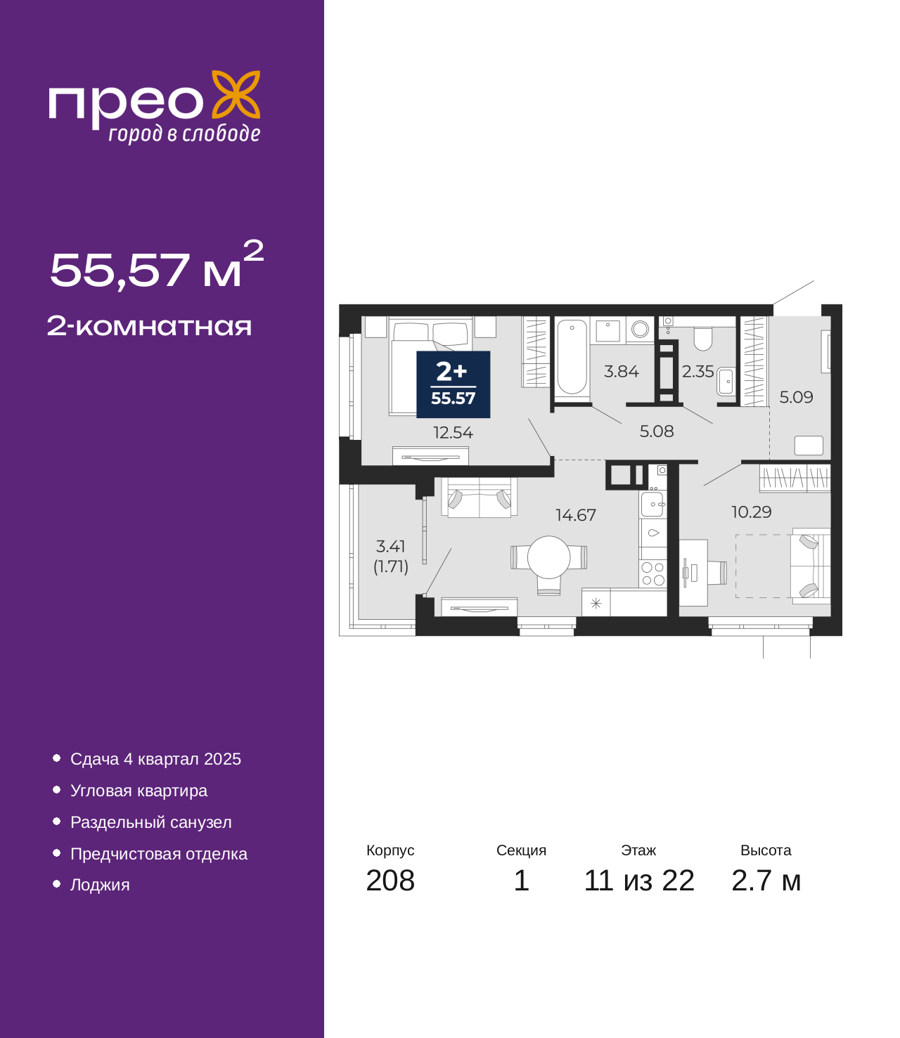 Просторная двухкомнатная квартира с предчистовой отделкой в ЖК "Прео" на 11 этаже. Общая площадь: 55.57 кв.м., жилая: 22.83 кв.м., площадь просторной кухни-столовой: 14.67 кв.м. Угловая квартира, окна oбecпeчивaют paвнoмepнoe ocвeщeниe в тeчeниe дня. В квартире одна лоджия, один раздельный санузел. Высота потолков 2.7 м. Дом монолитный, трехподъездный, переменной этажности, от 14 до 22 этажей. Квартира находится в 1-й секции высотой 22 этажа в корпусе 208. На этаже 8 квартир. В подъезде 1 пассажирский и 1 грузовой лифт. Окончание строительства - 1 квартал 2026 года. Оформление сделки по договору долевого участия. Преображенский — один из самых привлекательных районов для жизни! Это полностью самостоятельный жилой район с точки зрения инфраструктуры. Преображенский находится между Московским и Червишевским трактами в квартале улиц Закалужская — Вьюжная — Александра Протозанова. Не нужно ждать, когда появится инфраструктура — переезжайте на всё готовое. Вблизи расположены действующие школа и детский сад. В этом году откроется еще один сад, а в следующем году — школа. По соседству с Преображенским запланировано строительство городского парка «Комарово» площадью 38 гектар. За 10 минут можно доехать на автомобиле до крупных ТРЦ: «Лента», «Кристалл», «Леруа Мерлен», «Метро» и «Ашан». С 2018 года в районе открыт Соседский центр — пространство, созданное для формирования добрососедской среды, совместного досуга, общения и реализации соседских инициатив. Здесь проходят встречи соседей, а также сами жители района организовывают мероприятия. Организатором такого события может стать любой желающий. В квартирах выполнена качественная предчистовая отделка. Гладкие стены с финишным выравниванием по маякам. Ровный потолок для установки натяжного потолка. Установлены пятикамерные окна с двойным стеклопакетом (3 стекла). Дизайнерские холлы с видеонаблюдением, безбарьерным и прозрачным входом – всегда светло и спокойно. На первом этаже есть просторные колясочные, где все жители могут оставлять свои коляски и велосипеды. В Преображенском есть всё, что нужно для активного отдыха и занятий спортом. Мы сделали большое футбольное поле с безопасным покрытием. Также установили хоккейный корт, который оборудован по всем необходимым стандартам. Во дворах можно делать упражнения на специальных площадках с турниками. Весь район мы обустроили велодорожками, которые связаны в единый маршрут. У нас есть сухие фонтаны, бьющие из земли, деревья, веревки, сетки, скалодром, газон, песок и резинка — осталось просто дать своему ребенку право на свободную игру. По-настоящему хорошие дворы — это те, которые дети предпочитают соцсетям и телевизору. (AQID02532110)