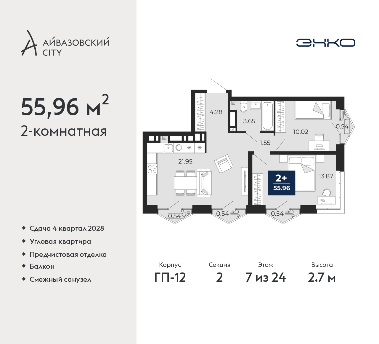 - Общая площадь 55.96 м²