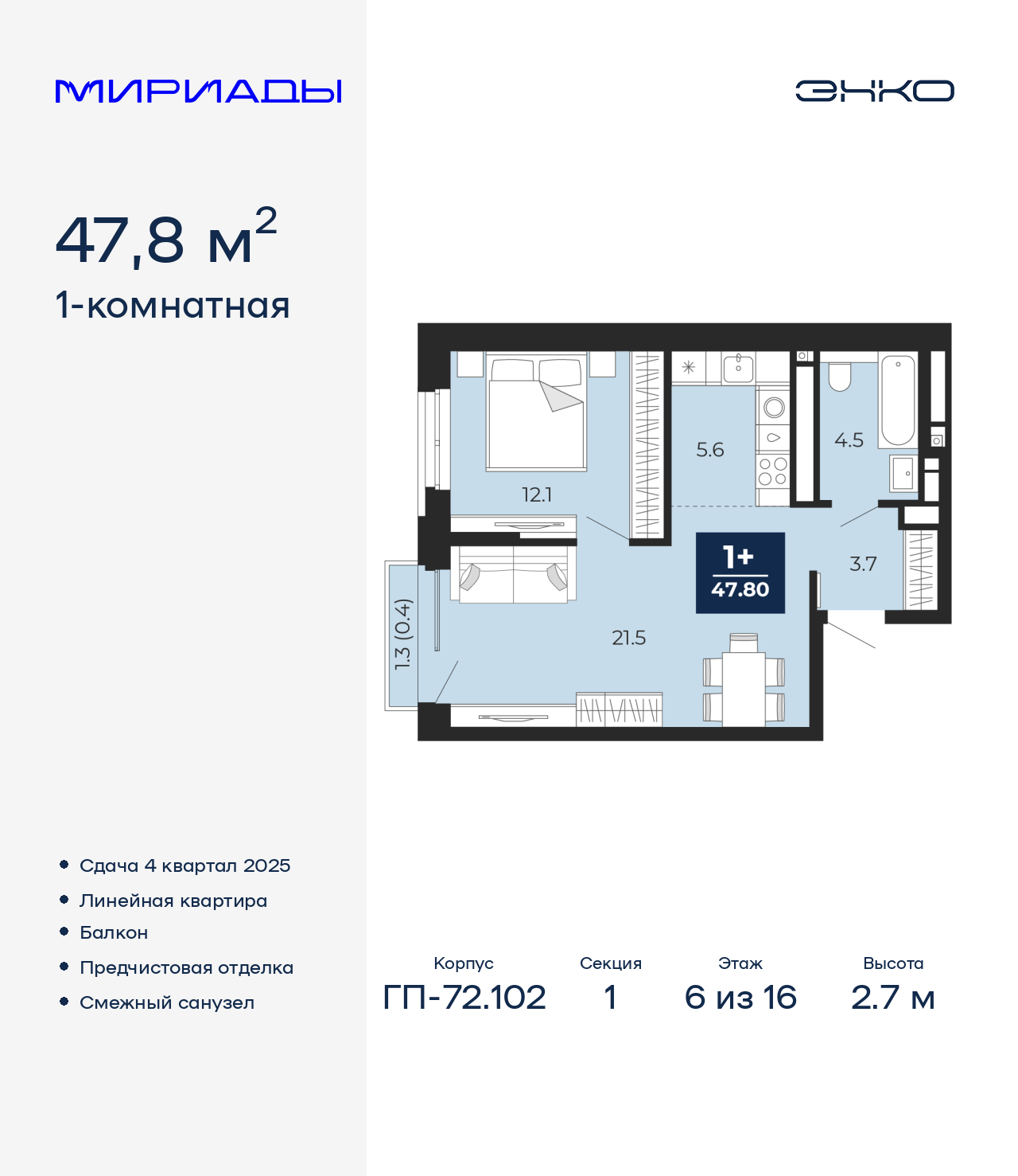 1-комн. квартира от застройщика с предчистовой отделкой в ЖК "Мириады" на 6 этаже. Общая площадь: 47.8 кв.м., жилая: 12.1 кв.м., площадь просторной кухни-столовой: 27.1 кв.м. Все окна выходят на одну сторону. В квартире один балкон, один совмещенный санузел. Высота потолков 2.7 м. Дом монолитный, многоподъездный, переменной этажности, от 14 до 16 этажей. Квартира находится в 1-й секции высотой 16 этажей в корпусе ГП-72.102. На этаже 9 квартир. В подъезде 1 пассажирский и 1 грузовой лифт. Окончание строительства - 1 квартал 2026 года. Оформление сделки по договору долевого участия. Вселенная бесконечных историй. Ранее невиданный Тюмени масштаб: территория 240 гектаров и 1 650 000 м² застройки. Мириады – это город масштабных перемен и больших возможностей. Город зеленых рощ и зеркальных озер. Город для работы, учебы и развлечений. Город для детей и их родителей. Город для всех и каждого. Проект расположен в районе Мыс рядом с ТРЦ «Тюмень Сити Молл» в границах улицы Тимофея Чаркова, Тобольского тракта и объездной дороги. Срок полного освоения территории - до 2034 года. (AQID02536548)