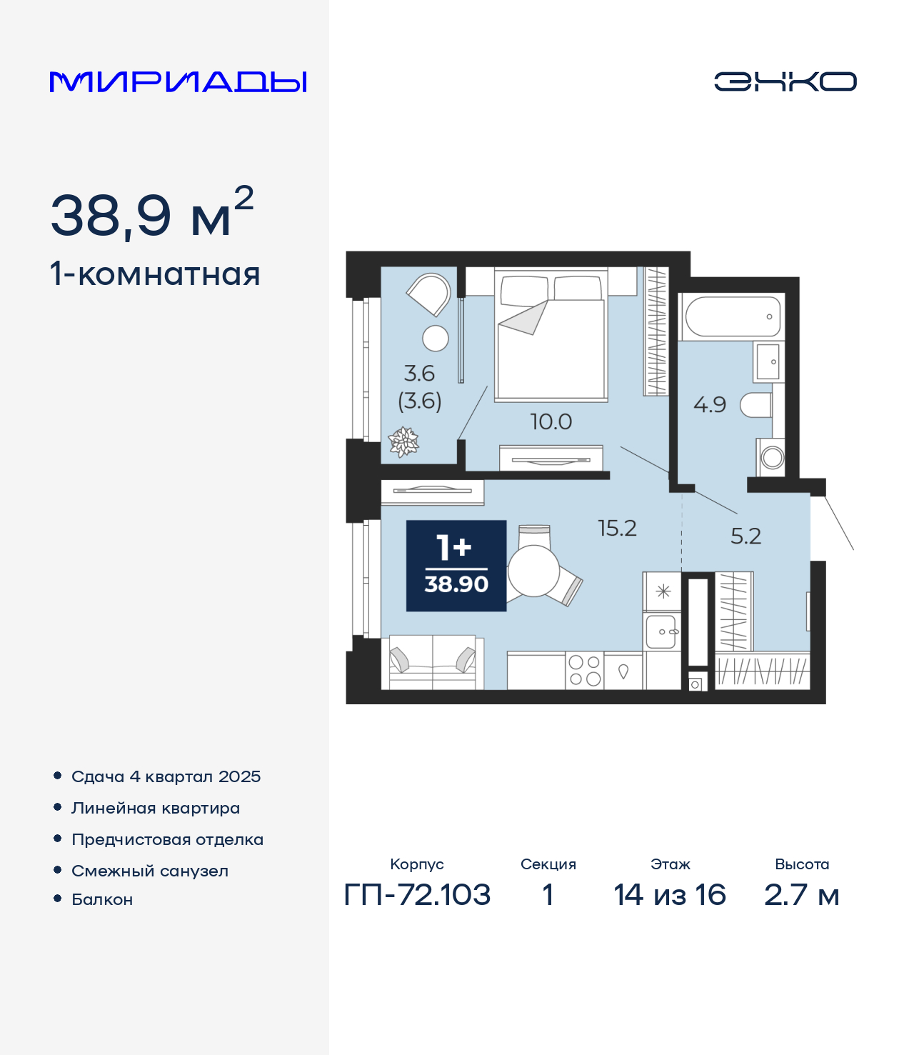 - Общая площадь 38.9 м²