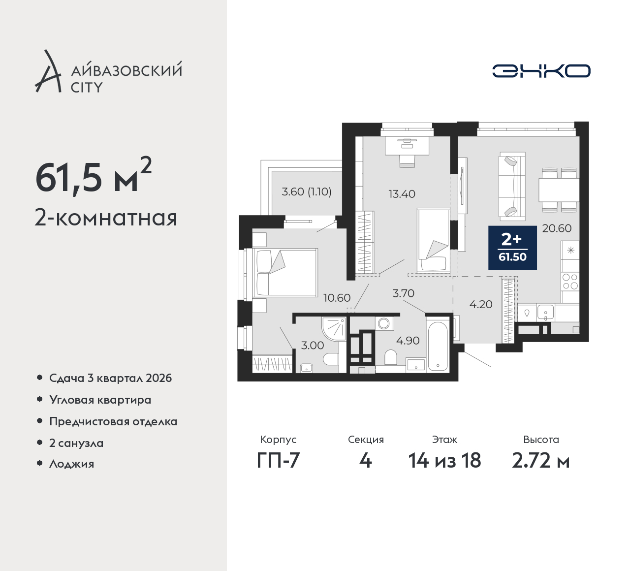 - Общая площадь 61.5 м²