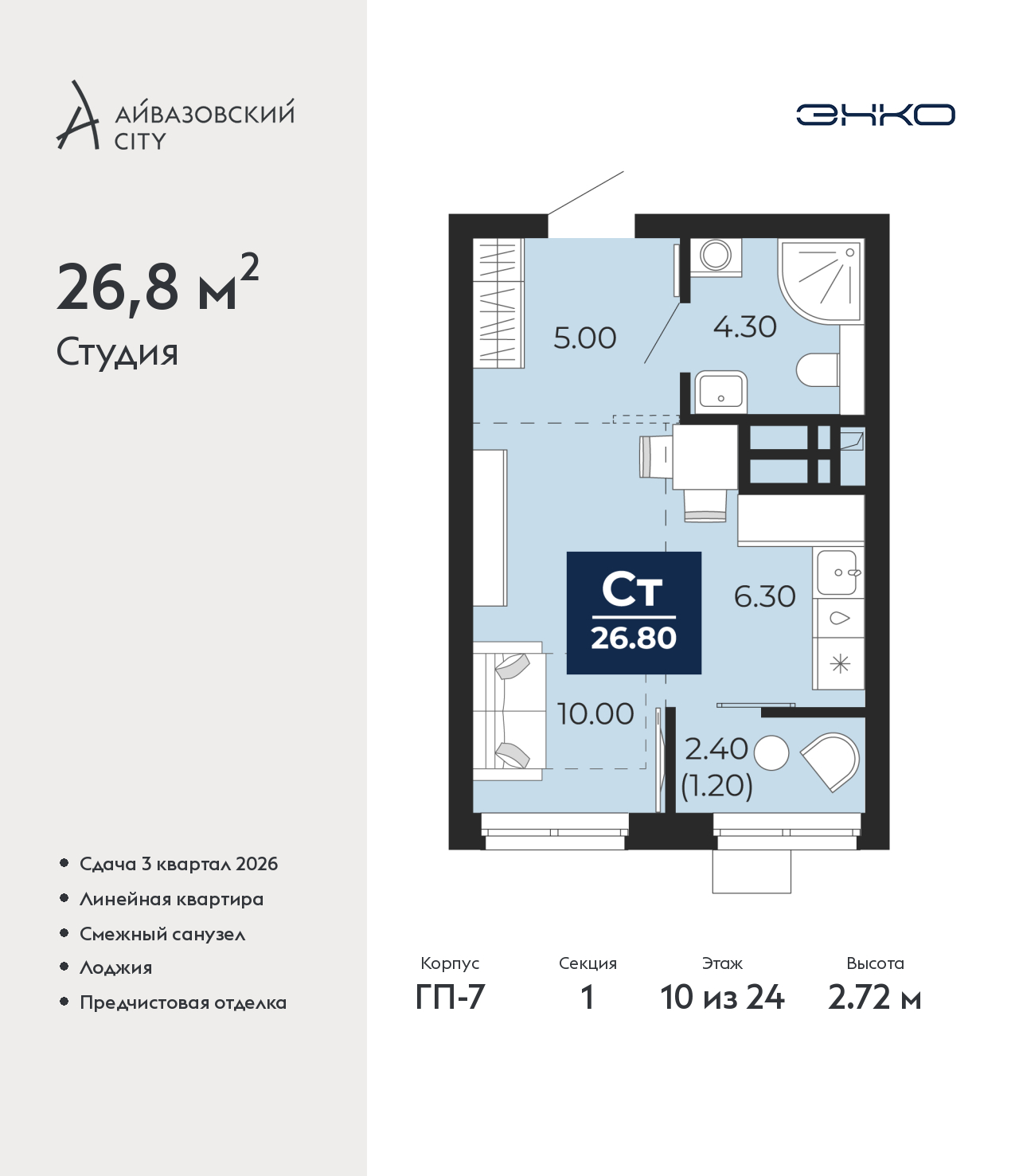 - Общая площадь 26.8 м²