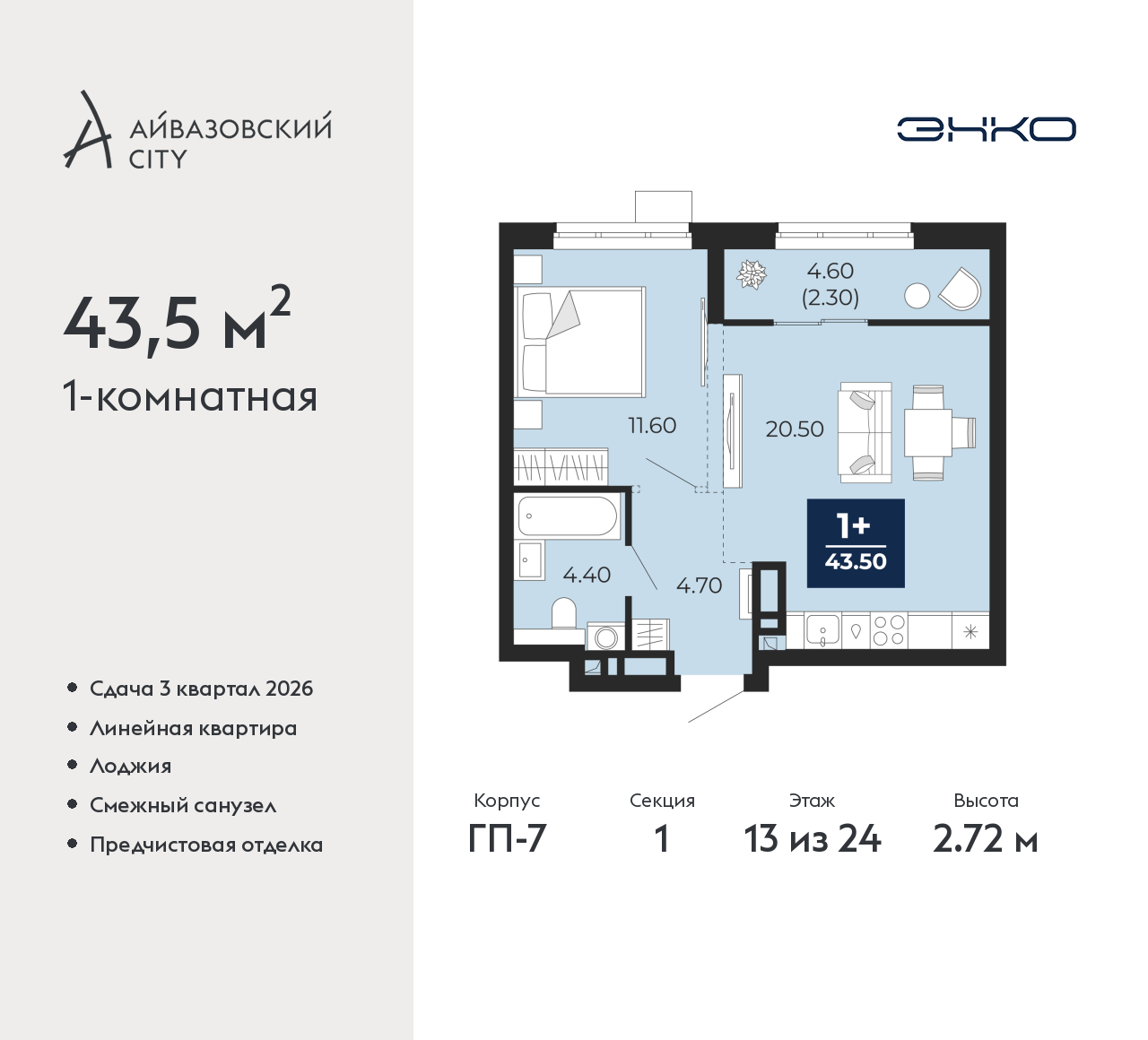 - Общая площадь 43.5 м²