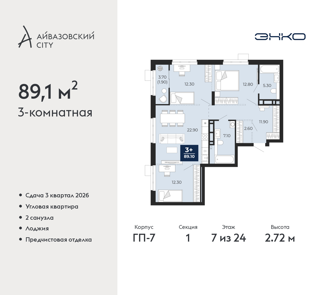 Просторная 3-комн. квартира с предчистовой отделкой в ЖК "Айвазовский City" на 7 этаже. Общая площадь: 89.1 кв.м., жилая: 37.4 кв.м., площадь просторной кухни-столовой: 22.9 кв.м. Угловая квартира, идеально подойдет любителям тишины и панорамных видов. В квартире одна лоджия, два совмещенных санузла. Высота потолков 2.72 м. Дом монолитный, многоподъездный, переменной этажности, от 9 до 24 этажей. Квартира находится в 1-й секции высотой 24 этажа в корпусе ГП-7. На этаже 6 квартир. В подъезде 1 пассажирский и 2 грузовых лифта. Окончание строительства - 3 квартал 2026 года. Оформление сделки по договору долевого участия. Новый жилой район располагается в живописном месте на берегу Туры в центральной части города. Принципиально новое пространство для жизни в центре современного города для тех, чьи мечты сбываются, кто нацелен на постоянный рост, перемены к лучшему для себя и своих близких. Каждая деталь Айвазовский City вдохновляет и заряжает на новые свершения: авторская архитектура, сбалансированная продуманная инфраструктура, дизайнерские дворы со спортивными и детскими площадками, парковые зоны с фонтанами, водный канал, украшающий центральный прогулочный маршрут района и многое другое. В 2019 года проект стал лауреатом престижной премии Urban Awards 2019 в номинации «Лучший строящийся региональный жилой комплекс бизнес-класса». Главная особенность Айвазовский City - соседство разных архитектурных школ в рамках одного дома. Изысканная классика, выразительная эклектика и оригинальный модерн - жить в одном из таких домов настоящий повод для гордости. Айвазовский City это идеальное сочетание комфорта, технологий и развитой инфраструктуры. Вход в подъезд возможен с улицы и со двора. Отправляясь на работу или за покупками, жители могут выйти с внешней стороны дома, а для прогулки с ребенком – со стороны двора. Экологически чистые материалы и энергосберегающие технологии, качественное освещение общественных зон, видеонаблюдение по всей территории жилого района (в том числе в подъездах, лифтах и в подземном паркинге), закрытые дворы с доступом только для жителей Айвазовский City. Часть домов в Айвазовский City будут оснащены подземным паркингом. Востребованный в нашем климатическом поясе формат хранения автомобилей защитит собственность владельца в любое время года. Аккредитация в банках: «Сбербанк России», ПАО Банк «ВТБ», ПАО «Газпромбанк», ОАО «Альфа-Банк», ПАО «Промсвязьбанк» и других. (AQID02487899)