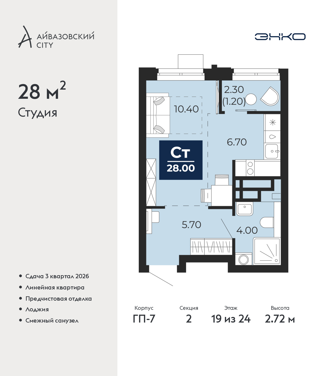 1-комн. квартира-студия от застройщика с предчистовой отделкой в ЖК "Айвазовский City" на 19 этаже. Общая площадь: 28 кв.м., площадь гостиной 17.1 кв.м., из которых 6.7 кв.м. выделено под кухонную зону. Все окна выходят на одну сторону. В квартире одна лоджия, один совмещенный санузел. Высота потолков 2.72 м. Дом монолитный, многоподъездный, переменной этажности, от 9 до 24 этажей. Квартира находится во 2-й секции высотой 24 этажа в корпусе ГП-7. На этаже 7 квартир. В подъезде 1 пассажирский и 2 грузовых лифта. Окончание строительства - 3 квартал 2026 года. Оформление сделки по договору долевого участия. Новый жилой район располагается в живописном месте на берегу Туры в центральной части города. Принципиально новое пространство для жизни в центре современного города для тех, чьи мечты сбываются, кто нацелен на постоянный рост, перемены к лучшему для себя и своих близких. Каждая деталь Айвазовский City вдохновляет и заряжает на новые свершения: авторская архитектура, сбалансированная продуманная инфраструктура, дизайнерские дворы со спортивными и детскими площадками, парковые зоны с фонтанами, водный канал, украшающий центральный прогулочный маршрут района и многое другое. В 2019 года проект стал лауреатом престижной премии Urban Awards 2019 в номинации «Лучший строящийся региональный жилой комплекс бизнес-класса». Главная особенность Айвазовский City - соседство разных архитектурных школ в рамках одного дома. Изысканная классика, выразительная эклектика и оригинальный модерн - жить в одном из таких домов настоящий повод для гордости. Айвазовский City это идеальное сочетание комфорта, технологий и развитой инфраструктуры. Вход в подъезд возможен с улицы и со двора. Отправляясь на работу или за покупками, жители могут выйти с внешней стороны дома, а для прогулки с ребенком – со стороны двора. Экологически чистые материалы и энергосберегающие технологии, качественное освещение общественных зон, видеонаблюдение по всей территории жилого района (в том числе в подъездах, лифтах и в подземном паркинге), закрытые дворы с доступом только для жителей Айвазовский City. Часть домов в Айвазовский City будут оснащены подземным паркингом. Востребованный в нашем климатическом поясе формат хранения автомобилей защитит собственность владельца в любое время года. Аккредитация в банках: ПАО «Газпромбанк», ОАО «Альфа-Банк», ПАО Банк «ВТБ», «Сбербанк России», ПАО Банк «ФК Открытие» и других. (AQID02487934)