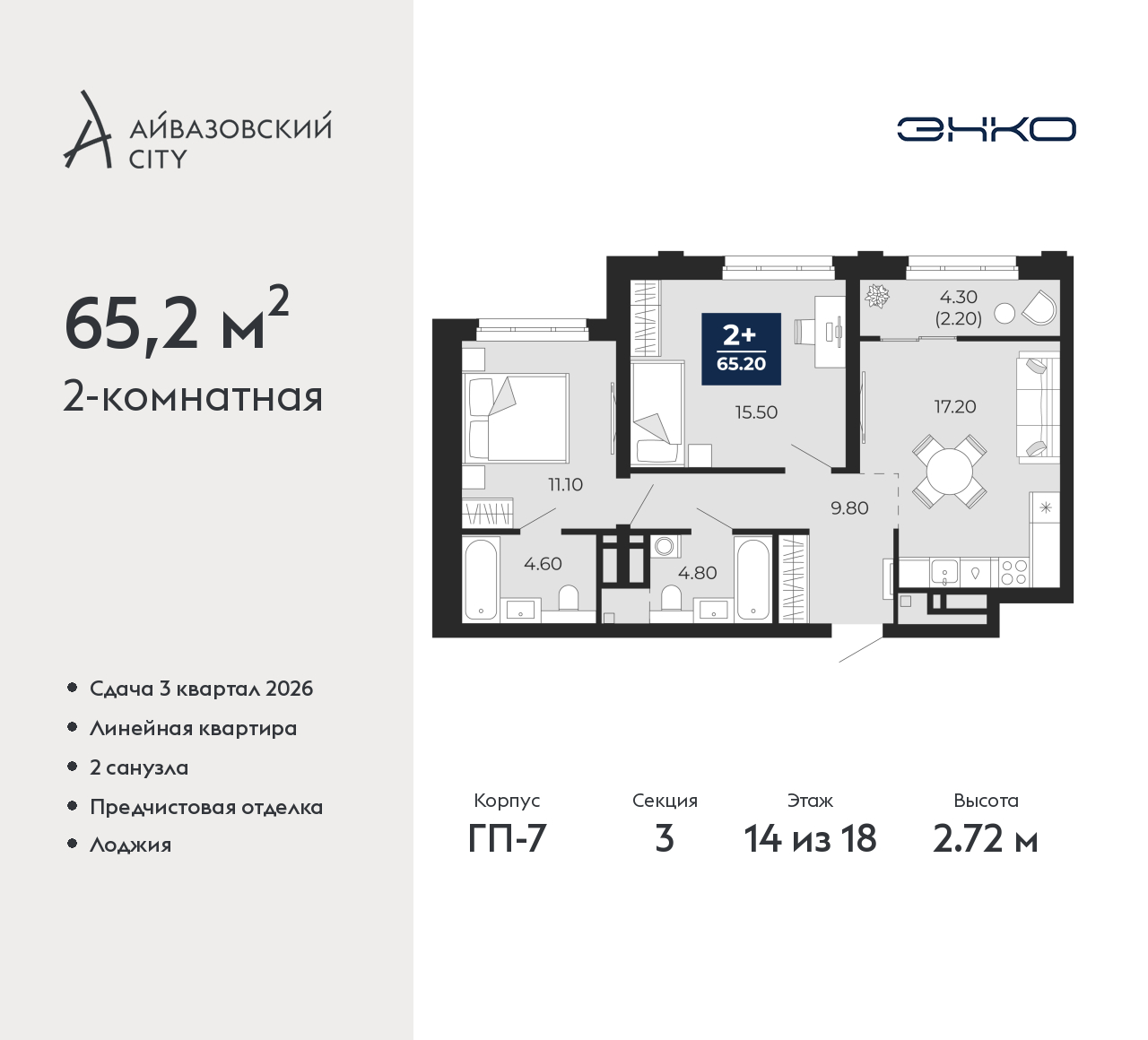2-комн. квартира с предчистовой отделкой в ЖК "Айвазовский City" на 14 этаже. Общая площадь: 65.2 кв.м., жилая: 26.6 кв.м., площадь просторной кухни-столовой: 17.2 кв.м. Комнаты изолированные, все окна выходят на одну сторону. В квартире одна лоджия, два совмещенных санузла. Высота потолков 2.72 м. Дом монолитный, многоподъездный, переменной этажности, от 9 до 24 этажей. Квартира находится в 3-й секции высотой 18 этажей в корпусе ГП-7. На этаже 5 квартир. В подъезде 1 пассажирский и 2 грузовых лифта. Окончание строительства - 3 квартал 2026 года. Оформление сделки по договору долевого участия. Новый жилой район располагается в живописном месте на берегу Туры в центральной части города. Принципиально новое пространство для жизни в центре современного города для тех, чьи мечты сбываются, кто нацелен на постоянный рост, перемены к лучшему для себя и своих близких. Каждая деталь Айвазовский City вдохновляет и заряжает на новые свершения: авторская архитектура, сбалансированная продуманная инфраструктура, дизайнерские дворы со спортивными и детскими площадками, парковые зоны с фонтанами, водный канал, украшающий центральный прогулочный маршрут района и многое другое. В 2019 года проект стал лауреатом престижной премии Urban Awards 2019 в номинации «Лучший строящийся региональный жилой комплекс бизнес-класса». Главная особенность Айвазовский City - соседство разных архитектурных школ в рамках одного дома. Изысканная классика, выразительная эклектика и оригинальный модерн - жить в одном из таких домов настоящий повод для гордости. Айвазовский City это идеальное сочетание комфорта, технологий и развитой инфраструктуры. Вход в подъезд возможен с улицы и со двора. Отправляясь на работу или за покупками, жители могут выйти с внешней стороны дома, а для прогулки с ребенком – со стороны двора. Экологически чистые материалы и энергосберегающие технологии, качественное освещение общественных зон, видеонаблюдение по всей территории жилого района (в том числе в подъездах, лифтах и в подземном паркинге), закрытые дворы с доступом только для жителей Айвазовский City. Часть домов в Айвазовский City будут оснащены подземным паркингом. Востребованный в нашем климатическом поясе формат хранения автомобилей защитит собственность владельца в любое время года. Аккредитация в банках: ПАО «Газпромбанк», ОАО «Альфа-Банк», «Сбербанк России», ПАО Банк «ВТБ», ПАО Банк «ФК Открытие» и других. (AQID02487955)