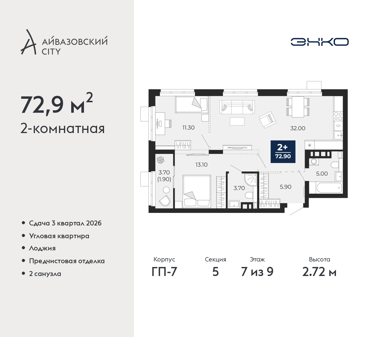 - Общая площадь 72.9 м²
