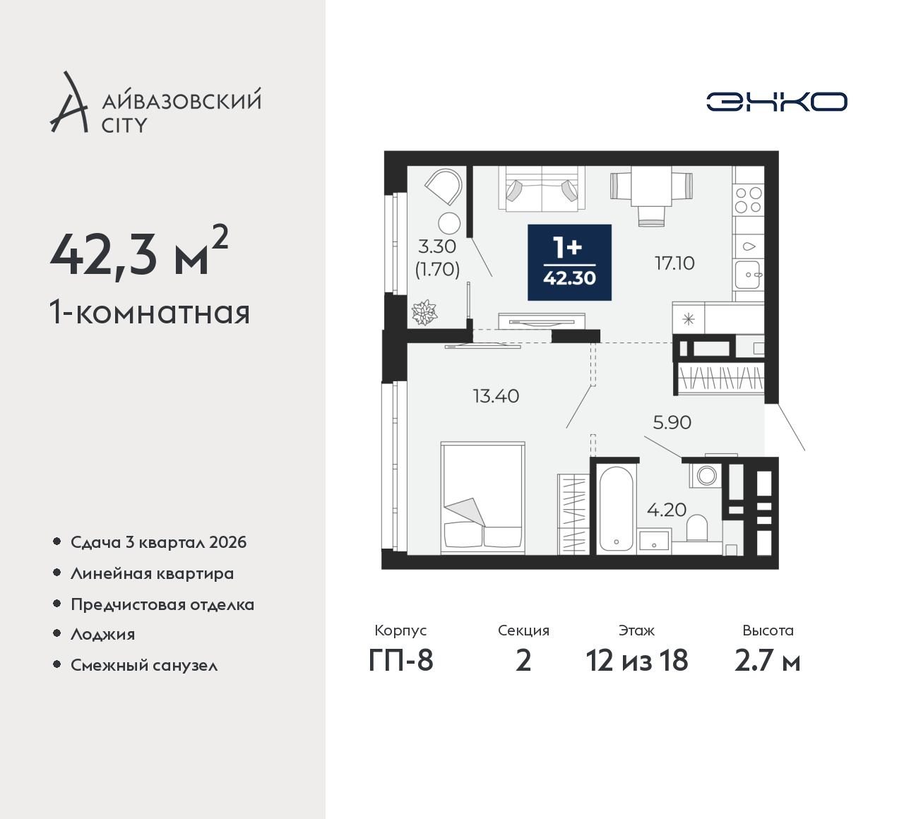 - Общая площадь 42.3 м²