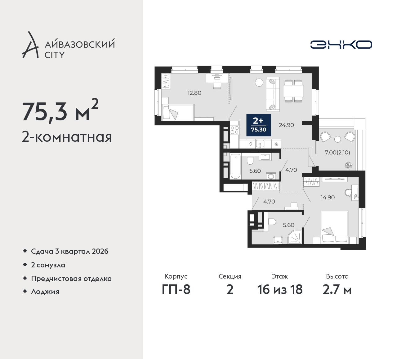 - Общая площадь 75.3 м²