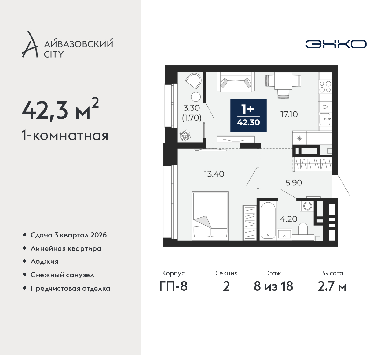 Продается однокомнатная квартира от застройщика с предчистовой отделкой в ЖК "Айвазовский City" на 8 этаже. Общая площадь: 42.3 кв.м., жилая: 13.4 кв.м., площадь просторной кухни-столовой: 17.1 кв.м. Все окна выходят на одну сторону. В квартире одна лоджия, один совмещенный санузел. Высота потолков 2.7 м. Дом монолитный, многоподъездный, переменной этажности, от 14 до 24 этажей. Квартира находится во 2-й секции высотой 18 этажей в корпусе ГП-8. На этаже 5 квартир. В подъезде 1 пассажирский и 1 грузовой лифт. Окончание строительства - 3 квартал 2026 года. Оформление сделки по договору долевого участия. Новый жилой район располагается в живописном месте на берегу Туры в центральной части города. Принципиально новое пространство для жизни в центре современного города для тех, чьи мечты сбываются, кто нацелен на постоянный рост, перемены к лучшему для себя и своих близких. Каждая деталь Айвазовский City вдохновляет и заряжает на новые свершения: авторская архитектура, сбалансированная продуманная инфраструктура, дизайнерские дворы со спортивными и детскими площадками, парковые зоны с фонтанами, водный канал, украшающий центральный прогулочный маршрут района и многое другое. В 2019 года проект стал лауреатом престижной премии Urban Awards 2019 в номинации «Лучший строящийся региональный жилой комплекс бизнес-класса». Главная особенность Айвазовский City - соседство разных архитектурных школ в рамках одного дома. Изысканная классика, выразительная эклектика и оригинальный модерн - жить в одном из таких домов настоящий повод для гордости. Айвазовский City это идеальное сочетание комфорта, технологий и развитой инфраструктуры. Вход в подъезд возможен с улицы и со двора. Отправляясь на работу или за покупками, жители могут выйти с внешней стороны дома, а для прогулки с ребенком – со стороны двора. Экологически чистые материалы и энергосберегающие технологии, качественное освещение общественных зон, видеонаблюдение по всей территории жилого района (в том числе в подъездах, лифтах и в подземном паркинге), закрытые дворы с доступом только для жителей Айвазовский City. Часть домов в Айвазовский City будут оснащены подземным паркингом. Востребованный в нашем климатическом поясе формат хранения автомобилей защитит собственность владельца в любое время года. Аккредитация в банках: ПАО «Газпромбанк», ПАО Банк «ВТБ», ОАО «Альфа-Банк», «Сбербанк России», ПАО «Совкомбанк» и других. (AQID02488018)