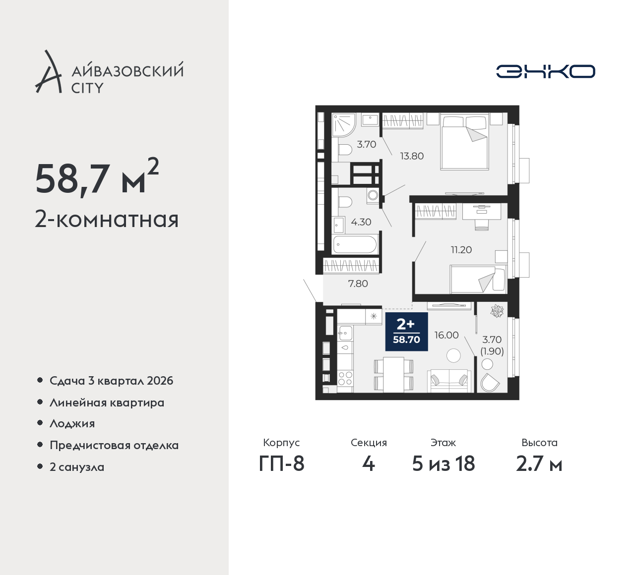 - Общая площадь 58.7 м²