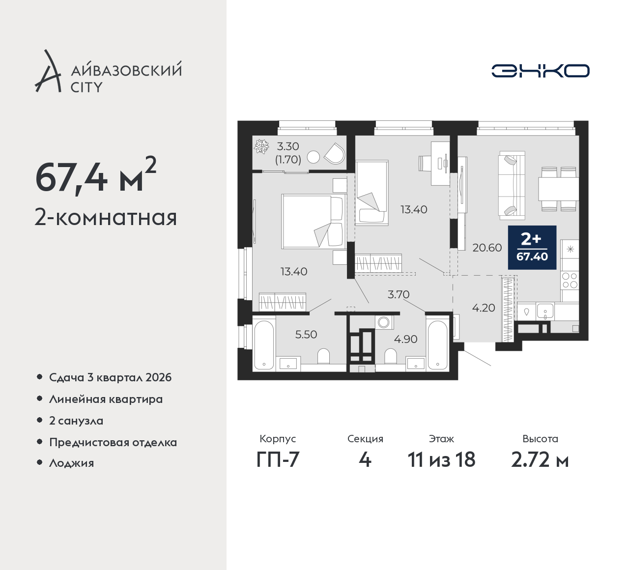 - Общая площадь 67.4 м²
