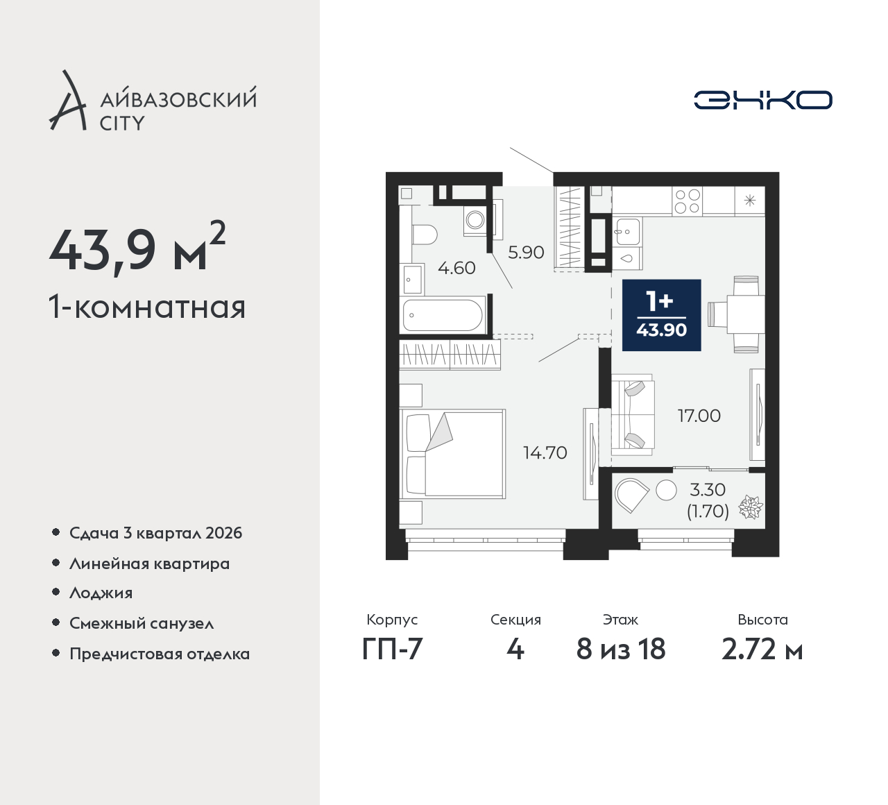 1-комн. квартира с предчистовой отделкой в ЖК "Айвазовский City" на 8 этаже. Общая площадь: 43.9 кв.м., жилая: 14.7 кв.м., площадь просторной кухни-столовой: 17 кв.м. Все окна выходят на одну сторону. В квартире одна лоджия, один совмещенный санузел. Высота потолков 2.72 м. Дом монолитный, многоподъездный, переменной этажности, от 9 до 24 этажей. Квартира находится в 4-й секции высотой 18 этажей в корпусе ГП-7. На этаже 5 квартир. В подъезде 1 пассажирский и 2 грузовых лифта. Окончание строительства - 3 квартал 2026 года. Оформление сделки по договору долевого участия. Новый жилой район располагается в живописном месте на берегу Туры в центральной части города. Принципиально новое пространство для жизни в центре современного города для тех, чьи мечты сбываются, кто нацелен на постоянный рост, перемены к лучшему для себя и своих близких. Каждая деталь Айвазовский City вдохновляет и заряжает на новые свершения: авторская архитектура, сбалансированная продуманная инфраструктура, дизайнерские дворы со спортивными и детскими площадками, парковые зоны с фонтанами, водный канал, украшающий центральный прогулочный маршрут района и многое другое. В 2019 года проект стал лауреатом престижной премии Urban Awards 2019 в номинации «Лучший строящийся региональный жилой комплекс бизнес-класса». Главная особенность Айвазовский City - соседство разных архитектурных школ в рамках одного дома. Изысканная классика, выразительная эклектика и оригинальный модерн - жить в одном из таких домов настоящий повод для гордости. Айвазовский City это идеальное сочетание комфорта, технологий и развитой инфраструктуры. Вход в подъезд возможен с улицы и со двора. Отправляясь на работу или за покупками, жители могут выйти с внешней стороны дома, а для прогулки с ребенком – со стороны двора. Экологически чистые материалы и энергосберегающие технологии, качественное освещение общественных зон, видеонаблюдение по всей территории жилого района (в том числе в подъездах, лифтах и в подземном паркинге), закрытые дворы с доступом только для жителей Айвазовский City. Часть домов в Айвазовский City будут оснащены подземным паркингом. Востребованный в нашем климатическом поясе формат хранения автомобилей защитит собственность владельца в любое время года. Аккредитация в банках: ПАО Банк «ВТБ», ОАО «Альфа-Банк», ПАО «Газпромбанк», «Сбербанк России», ПАО «Совкомбанк» и других. (AQID02499169)