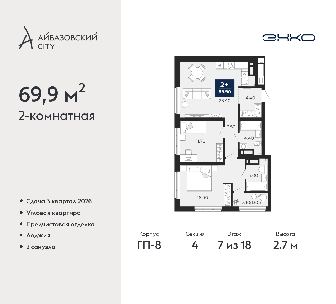 Двухкомнатная квартира от застройщика с предчистовой отделкой в ЖК "Айвазовский City" на 7 этаже. Общая площадь: 69.9 кв.м., жилая: 28.6 кв.м., площадь просторной кухни-столовой: 23.4 кв.м. Квартира угловая, идеально подойдет любителям тишины и панорамных видов. В квартире одна лоджия, два совмещенных санузла. Высота потолков 2.7 м. Дом монолитный, многоподъездный, переменной этажности, от 14 до 24 этажей. Квартира находится в 4-й секции высотой 18 этажей в корпусе ГП-8. На этаже 6 квартир. В подъезде 1 пассажирский и 1 грузовой лифт. Окончание строительства - 3 квартал 2026 года. Оформление сделки по договору долевого участия. Новый жилой район располагается в живописном месте на берегу Туры в центральной части города. Принципиально новое пространство для жизни в центре современного города для тех, чьи мечты сбываются, кто нацелен на постоянный рост, перемены к лучшему для себя и своих близких. Каждая деталь Айвазовский City вдохновляет и заряжает на новые свершения: авторская архитектура, сбалансированная продуманная инфраструктура, дизайнерские дворы со спортивными и детскими площадками, парковые зоны с фонтанами, водный канал, украшающий центральный прогулочный маршрут района и многое другое. В 2019 года проект стал лауреатом престижной премии Urban Awards 2019 в номинации «Лучший строящийся региональный жилой комплекс бизнес-класса». Главная особенность Айвазовский City - соседство разных архитектурных школ в рамках одного дома. Изысканная классика, выразительная эклектика и оригинальный модерн - жить в одном из таких домов настоящий повод для гордости. Айвазовский City это идеальное сочетание комфорта, технологий и развитой инфраструктуры. Вход в подъезд возможен с улицы и со двора. Отправляясь на работу или за покупками, жители могут выйти с внешней стороны дома, а для прогулки с ребенком – со стороны двора. Экологически чистые материалы и энергосберегающие технологии, качественное освещение общественных зон, видеонаблюдение по всей территории жилого района (в том числе в подъездах, лифтах и в подземном паркинге), закрытые дворы с доступом только для жителей Айвазовский City. Часть домов в Айвазовский City будут оснащены подземным паркингом. Востребованный в нашем климатическом поясе формат хранения автомобилей защитит собственность владельца в любое время года. Аккредитация в банках: ПАО Банк «ВТБ», ПАО «Газпромбанк», ОАО «Альфа-Банк», «Сбербанк России», АО "ДОМ.РФ" и других. (AQID02509816)
