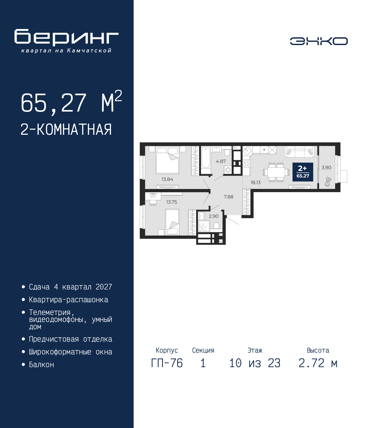 Просторная 2-комн. квартира с предчистовой отделкой в ЖК "Беринг" на 10 этаже. Общая площадь: 65.27 кв.м., жилая: 27.59 кв.м., площадь просторной кухни-столовой: 18.13 кв.м. Квартира - распашонка, без проходных комнат, окна выходят на paзные стороны дома. В квартире один балкон, два совмещенных санузла. Высота потолков 2.72 м. Дом монолитный, черырехподъездный, переменной этажности, от 19 до 24 этажей. Квартира находится в 1-й секции высотой 23 этажа в корпусе ГП-76. На этаже 7 квартир. В подъезде 2 пассажирских и 1 грузовой лифт. Окончание строительства - 4 квартал 2027 года. Оформление сделки по договору долевого участия. Подобно знаменитому исследователю, мы чувствуем себя первооткрывателями этой локации. Хотим показать новую суть места, сформировать для вас жизненный опыт, которого ещё не было. Беринг — район зелёного цвета. Беринг — район, который откроется вам с другой стороны. Впечатлит новым уровнем комфорта и качеством жизни. Беринг — открытие на карте города. Первый квартал расположен в районе Тура, в границах улиц: Камчатская – Западносибирская – Энтузиастов. Вокруг уже есть всё для того, чтобы ежедневная рутина была лишь частью жизни и не доставляла дискомфорта. Школы и детские сады, магазины и аптеки, поликлиника, места для семейного отдыха, пеших и велопрогулок, и даже рыбалки. Масштабное озеленение дворов — визитная карточка ЭНКО и ваш оазис спокойствия, чтобы отвлечься от повседневности. Раскидистые деревья, кустарники, травы и цветы — осталось остановиться, вдохнуть и расслабиться, глядя на эту природную красоту. Стилистика подъездов продолжает концепцию Беринга, вдохновлённого Камчаткой: сдержанный, но при этом впечатляющий дизайн соседствует с удобством и функциональностью. (AQID02517999)