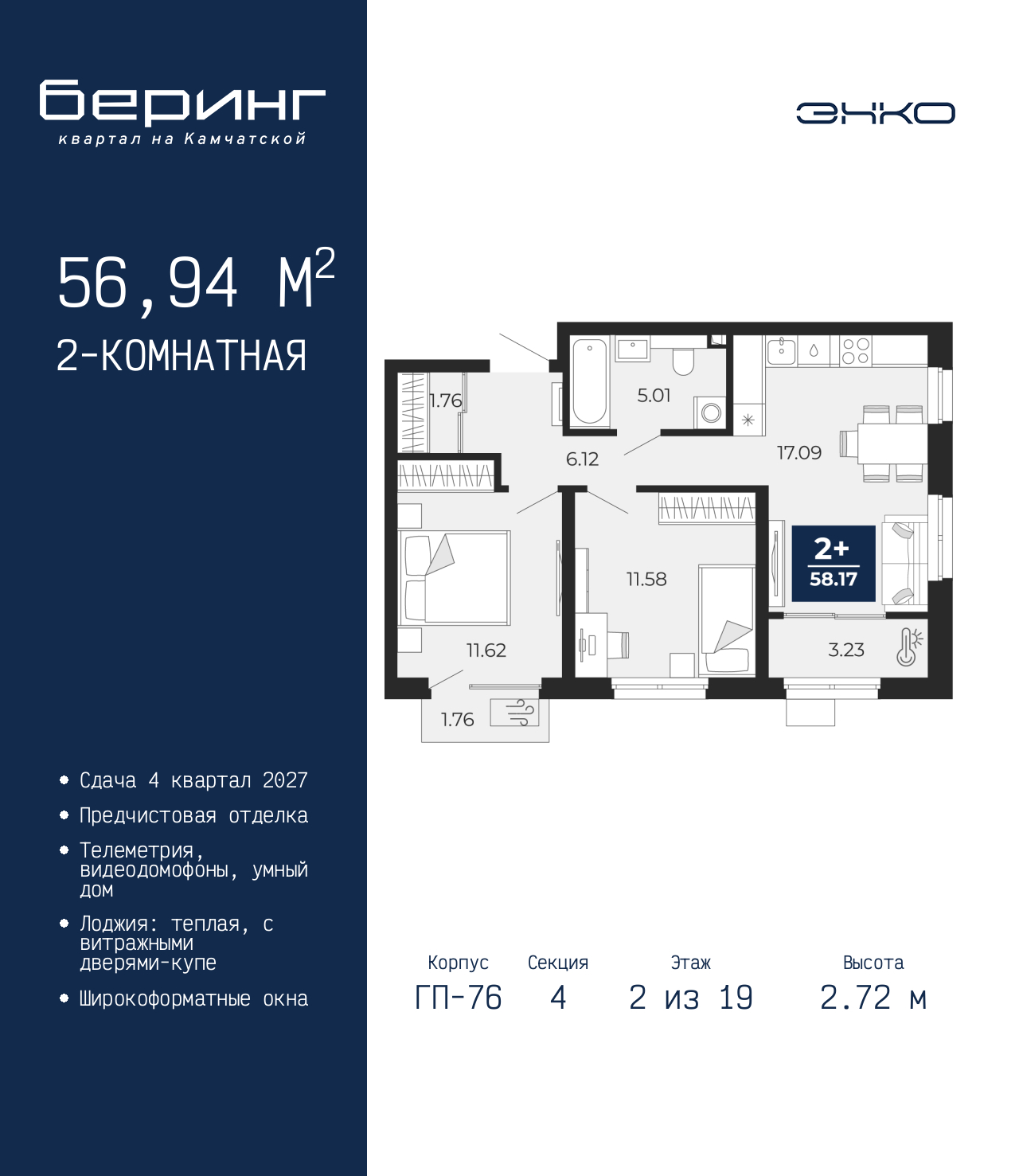 2-комн. квартира от застройщика с предчистовой отделкой в ЖК "Беринг" на 2 этаже. Общая площадь: 56.94 кв.м., жилая: 23.2 кв.м., площадь просторной кухни-столовой: 17.09 кв.м. Угловая квартира, очень светлая, естественная вентиляция при открытии окон. В квартире один балкон и одна лоджия, один совмещенный санузел. Высота потолков 2.72 м. Дом монолитный, черырехподъездный, переменной этажности, от 19 до 24 этажей. Квартира находится в 4-й секции высотой 19 этажей в корпусе ГП-76. На этаже 5 квартир. В подъезде 1 пассажирский и 1 грузовой лифт. Окончание строительства - 4 квартал 2027 года. Оформление сделки по договору долевого участия. Подобно знаменитому исследователю, мы чувствуем себя первооткрывателями этой локации. Хотим показать новую суть места, сформировать для вас жизненный опыт, которого ещё не было. Беринг — район зелёного цвета. Беринг — район, который откроется вам с другой стороны. Впечатлит новым уровнем комфорта и качеством жизни. Беринг — открытие на карте города. Первый квартал расположен в районе Тура, в границах улиц: Камчатская – Западносибирская – Энтузиастов. Вокруг уже есть всё для того, чтобы ежедневная рутина была лишь частью жизни и не доставляла дискомфорта. Школы и детские сады, магазины и аптеки, поликлиника, места для семейного отдыха, пеших и велопрогулок, и даже рыбалки. Масштабное озеленение дворов — визитная карточка ЭНКО и ваш оазис спокойствия, чтобы отвлечься от повседневности. Раскидистые деревья, кустарники, травы и цветы — осталось остановиться, вдохнуть и расслабиться, глядя на эту природную красоту. Стилистика подъездов продолжает концепцию Беринга, вдохновлённого Камчаткой: сдержанный, но при этом впечатляющий дизайн соседствует с удобством и функциональностью. (AQID02518328)