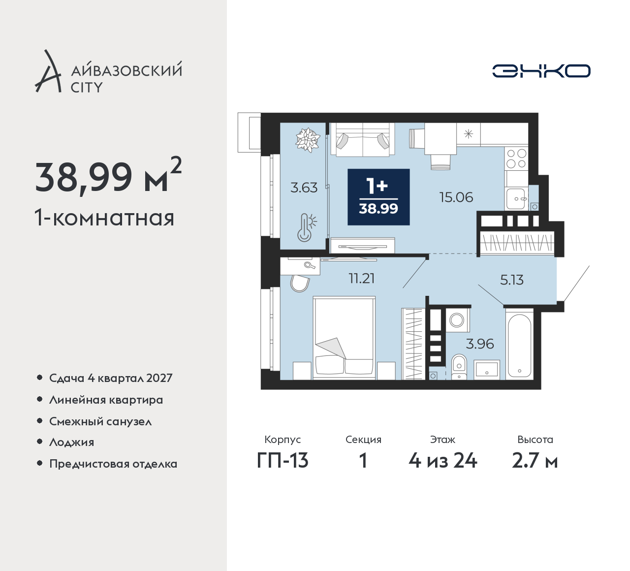 - Общая площадь 38.99 м²