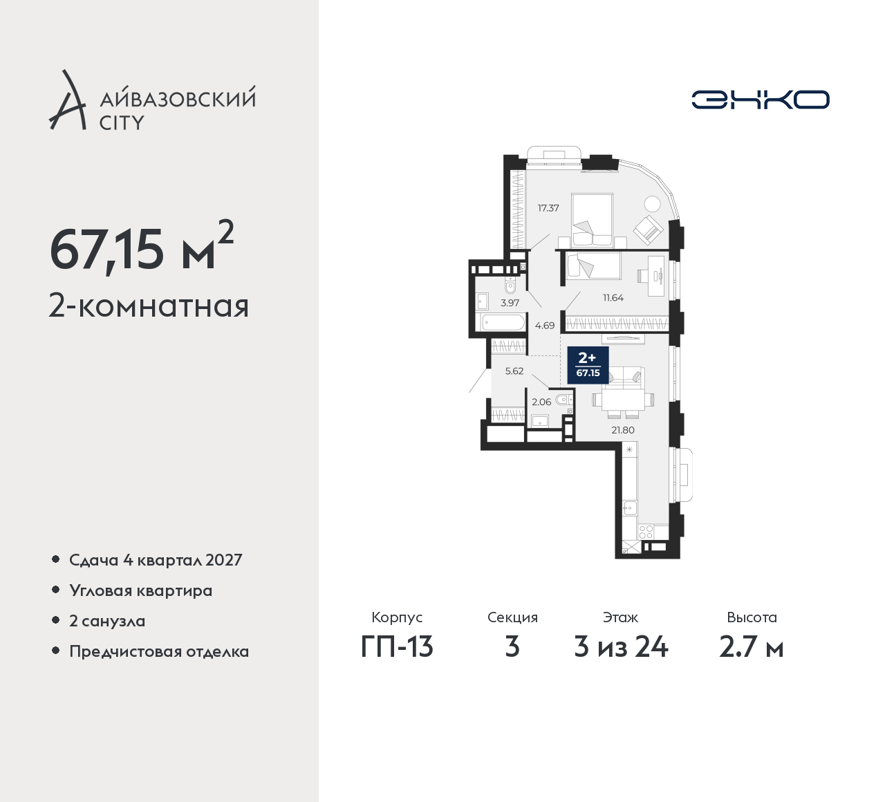 - Общая площадь 67.15 м²