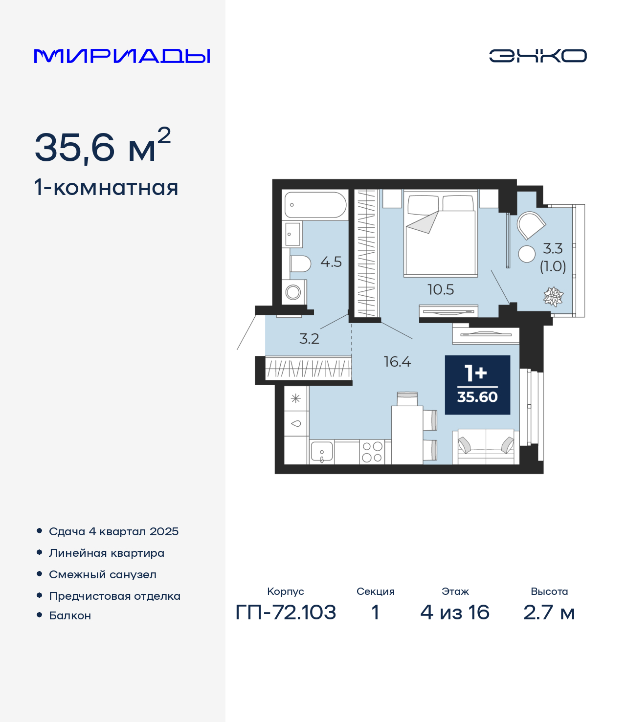 Продается 1-комн. квартира с предчистовой отделкой в ЖК "Мириады" на 4 этаже. Общая площадь: 35.6 кв.м., жилая: 10.5 кв.м., площадь просторной кухни-столовой: 16.4 кв.м. Все окна выходят на одну сторону. В квартире один балкон, один совмещенный санузел. Высота потолков 2.7 м. Дом монолитный, трехподъездный, переменной этажности, от 14 до 16 этажей. Квартира находится в 1-й секции высотой 16 этажей в корпусе ГП-72.103. На этаже 8 квартир. В подъезде 1 пассажирский и 1 грузовой лифт. Окончание строительства - 1 квартал 2026 года. Оформление сделки по договору долевого участия. Вселенная бесконечных историй. Ранее невиданный Тюмени масштаб: территория 240 гектаров и 1 650 000 м² застройки. Мириады – это город масштабных перемен и больших возможностей. Город зеленых рощ и зеркальных озер. Город для работы, учебы и развлечений. Город для детей и их родителей. Город для всех и каждого. Проект расположен в районе Мыс рядом с ТРЦ «Тюмень Сити Молл» в границах улицы Тимофея Чаркова, Тобольского тракта и объездной дороги. Срок полного освоения территории - до 2034 года. (AQID02522591)