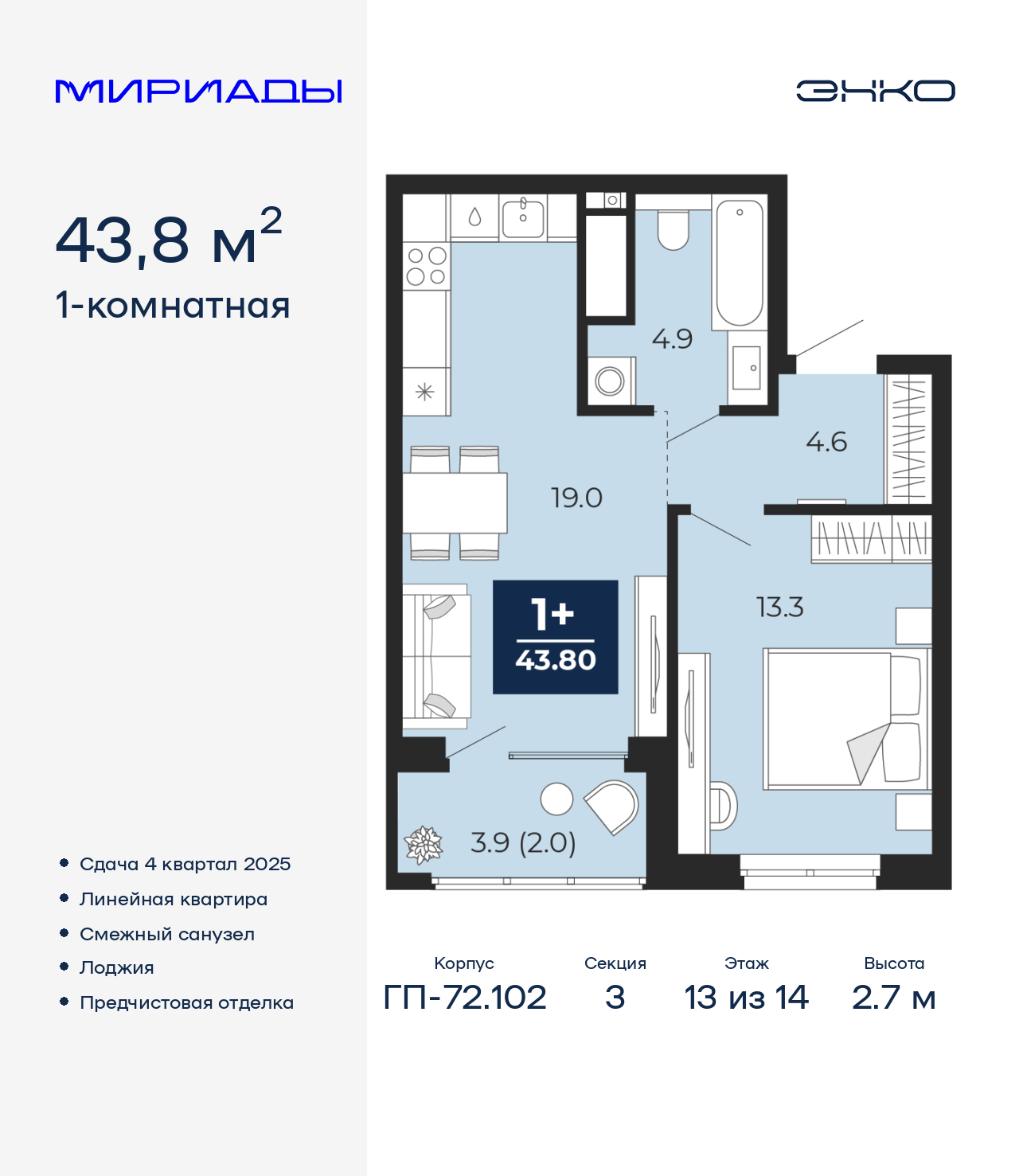 1-комн. квартира с предчистовой отделкой в ЖК "Мириады" на 13 этаже. Общая площадь: 43.8 кв.м., жилая: 13.3 кв.м., площадь просторной кухни-столовой: 19 кв.м. Все окна выходят на одну сторону. В квартире одна лоджия, один совмещенный санузел. Высота потолков 2.7 м. Дом монолитный, многоподъездный, переменной этажности, от 14 до 16 этажей. Квартира находится в 3-й секции высотой 14 этажей в корпусе ГП-72.102. На этаже 5 квартир. В подъезде 1 пассажирский и 1 грузовой лифт. Окончание строительства - 1 квартал 2026 года. Оформление сделки по договору долевого участия. Вселенная бесконечных историй. Ранее невиданный Тюмени масштаб: территория 240 гектаров и 1 650 000 м² застройки. Мириады – это город масштабных перемен и больших возможностей. Город зеленых рощ и зеркальных озер. Город для работы, учебы и развлечений. Город для детей и их родителей. Город для всех и каждого. Проект расположен в районе Мыс рядом с ТРЦ «Тюмень Сити Молл» в границах улицы Тимофея Чаркова, Тобольского тракта и объездной дороги. Срок полного освоения территории - до 2034 года. (AQID02522647)