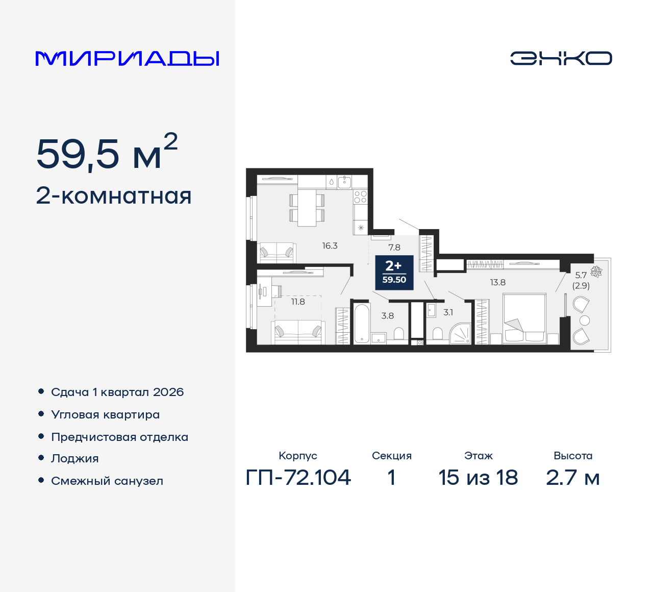 - Общая площадь 59.5 м²
