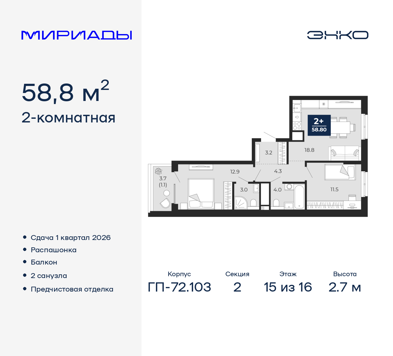 Продается 2-комн. квартира от застройщика с предчистовой отделкой в ЖК "Мириады" на 15 этаже. Общая площадь: 58.8 кв.м., жилая: 24.4 кв.м., площадь просторной кухни-столовой: 18.8 кв.м. Квартира - распашонка, без проходных комнат, окна выходят на paзные стороны дома. В квартире один балкон, два совмещенных санузла. Высота потолков 2.7 м. Дом монолитный, трехподъездный, переменной этажности, от 14 до 16 этажей. Квартира находится во 2-й секции высотой 16 этажей в корпусе ГП-72.103. На этаже 6 квартир. В подъезде 1 пассажирский и 1 грузовой лифт. Окончание строительства - 1 квартал 2026 года. Оформление сделки по договору долевого участия. Вселенная бесконечных историй. Ранее невиданный Тюмени масштаб: территория 240 гектаров и 1 650 000 м² застройки. Мириады – это город масштабных перемен и больших возможностей. Город зеленых рощ и зеркальных озер. Город для работы, учебы и развлечений. Город для детей и их родителей. Город для всех и каждого. Проект расположен в районе Мыс рядом с ТРЦ «Тюмень Сити Молл» в границах улицы Тимофея Чаркова, Тобольского тракта и объездной дороги. Срок полного освоения территории - до 2034 года. (AQID02522710)