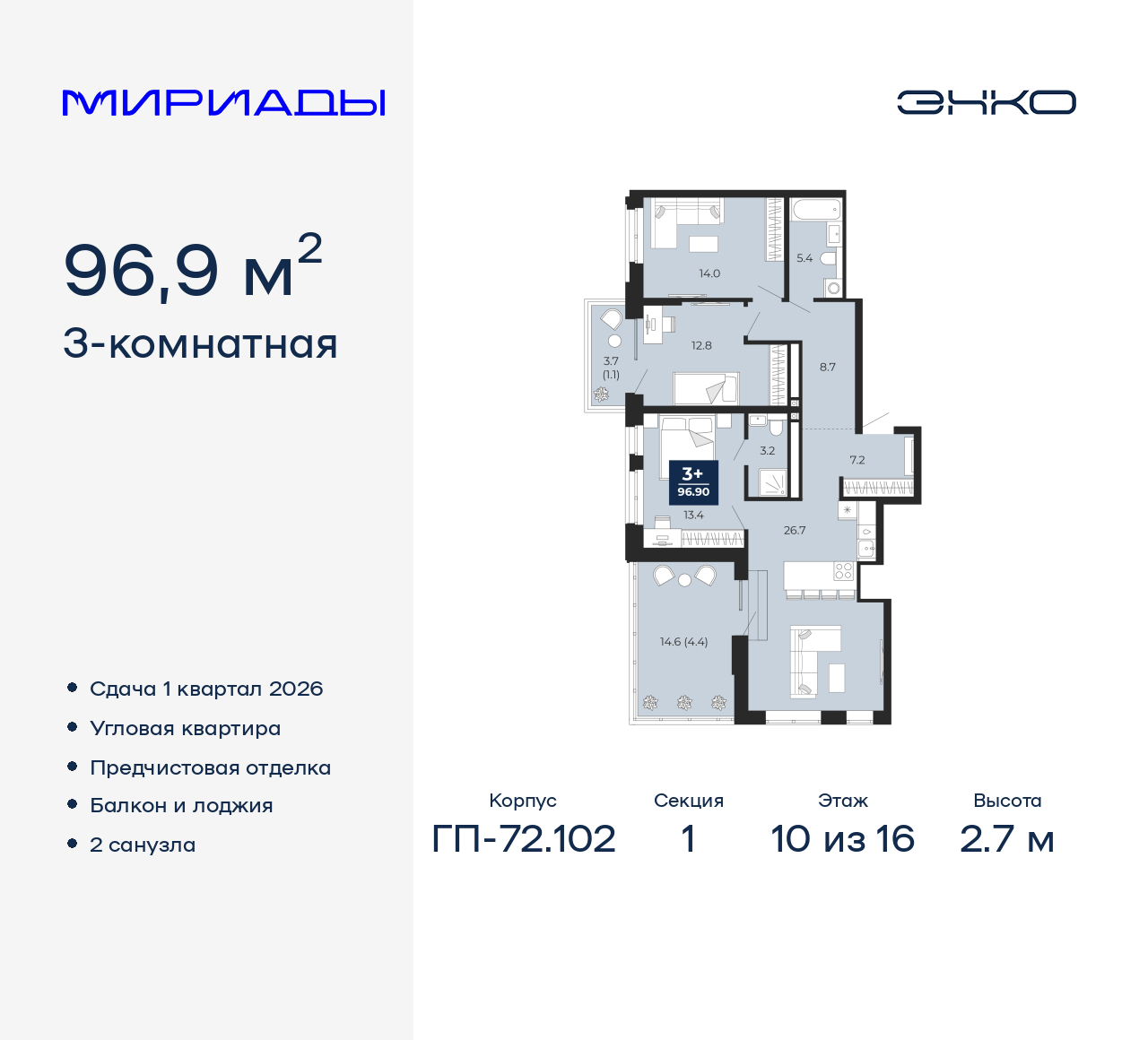 3-комн. квартира от застройщика с предчистовой отделкой в ЖК "Мириады" на 10 этаже. Общая площадь: 96.9 кв.м., жилая: 40.2 кв.м., площадь просторной кухни-столовой: 26.7 кв.м. Квартира угловая, окна oбecпeчивaют paвнoмepнoe ocвeщeниe в тeчeниe дня. В квартире один балкон и одна лоджия, два совмещенных санузла. Наличие террасы в квартире открывает возможность для создания зон отдыха в кругу семьи и друзей. Высота потолков 2.7 м. Дом монолитный, многоподъездный, переменной этажности, от 14 до 16 этажей. Квартира находится в 1-й секции высотой 16 этажей в корпусе ГП-72.102. На этаже 9 квартир. В подъезде 1 пассажирский и 1 грузовой лифт. Окончание строительства - 1 квартал 2026 года. Оформление сделки по договору долевого участия. Вселенная бесконечных историй. Ранее невиданный Тюмени масштаб: территория 240 гектаров и 1 650 000 м² застройки. Мириады – это город масштабных перемен и больших возможностей. Город зеленых рощ и зеркальных озер. Город для работы, учебы и развлечений. Город для детей и их родителей. Город для всех и каждого. Проект расположен в районе Мыс рядом с ТРЦ «Тюмень Сити Молл» в границах улицы Тимофея Чаркова, Тобольского тракта и объездной дороги. Срок полного освоения территории - до 2034 года. (AQID02522759)