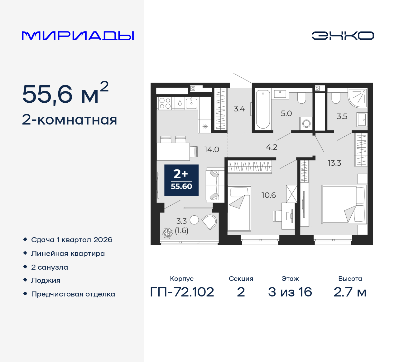 Двухкомнатная квартира с предчистовой отделкой в ЖК "Мириады" на 3 этаже. Общая площадь: 55.6 кв.м., жилая: 23.9 кв.м., площадь просторной кухни-столовой: 14 кв.м. Комнаты изолированные, все окна выходят на одну сторону. В квартире одна лоджия, два совмещенных санузла. Высота потолков 2.7 м. Дом монолитный, многоподъездный, переменной этажности, от 14 до 16 этажей. Квартира находится во 2-й секции высотой 16 этажей в корпусе ГП-72.102. На этаже 6 квартир. В подъезде 1 пассажирский и 1 грузовой лифт. Окончание строительства - 1 квартал 2026 года. Оформление сделки по договору долевого участия. Вселенная бесконечных историй. Ранее невиданный Тюмени масштаб: территория 240 гектаров и 1 650 000 м² застройки. Мириады – это город масштабных перемен и больших возможностей. Город зеленых рощ и зеркальных озер. Город для работы, учебы и развлечений. Город для детей и их родителей. Город для всех и каждого. Проект расположен в районе Мыс рядом с ТРЦ «Тюмень Сити Молл» в границах улицы Тимофея Чаркова, Тобольского тракта и объездной дороги. Срок полного освоения территории - до 2034 года. (AQID02522822)