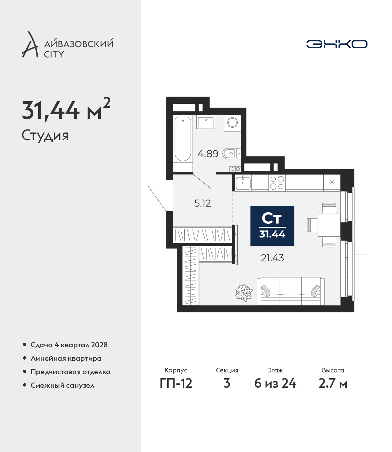 Продается однокомнатная квартира-студия с предчистовой отделкой в ЖК "Айвазовский City" на 6 этаже. Общая площадь: 31.44 кв.м., площадь гостиной 21.43 кв.м., из которых 5 кв.м. выделено под кухонную зону. Все окна выходят на одну сторону. В квартире один совмещенный санузел. Высота потолков 2.7 м. Дом монолитный, многоподъездный, высотой 24 этажа. Квартира находится в 3-й секции в корпусе ГП-12. На этаже 6 квартир. В подъезде 1 пассажирский и 1 грузовой лифт. Окончание строительства - 4 квартал 2028 года. Оформление сделки по договору долевого участия. Новый жилой район располагается в живописном месте на берегу Туры в центральной части города. Принципиально новое пространство для жизни в центре современного города для тех, чьи мечты сбываются, кто нацелен на постоянный рост, перемены к лучшему для себя и своих близких. Каждая деталь Айвазовский City вдохновляет и заряжает на новые свершения: авторская архитектура, сбалансированная продуманная инфраструктура, дизайнерские дворы со спортивными и детскими площадками, парковые зоны с фонтанами, водный канал, украшающий центральный прогулочный маршрут района и многое другое. В 2019 года проект стал лауреатом престижной премии Urban Awards 2019 в номинации «Лучший строящийся региональный жилой комплекс бизнес-класса». Главная особенность Айвазовский City - соседство разных архитектурных школ в рамках одного дома. Изысканная классика, выразительная эклектика и оригинальный модерн - жить в одном из таких домов настоящий повод для гордости. Айвазовский City это идеальное сочетание комфорта, технологий и развитой инфраструктуры. Вход в подъезд возможен с улицы и со двора. Отправляясь на работу или за покупками, жители могут выйти с внешней стороны дома, а для прогулки с ребенком – со стороны двора. Экологически чистые материалы и энергосберегающие технологии, качественное освещение общественных зон, видеонаблюдение по всей территории жилого района (в том числе в подъездах, лифтах и в подземном паркинге), закрытые дворы с доступом только для жителей Айвазовский City. Часть домов в Айвазовский City будут оснащены подземным паркингом. Востребованный в нашем климатическом поясе формат хранения автомобилей защитит собственность владельца в любое время года. Аккредитация в банках: ПАО Банк «ВТБ», ОАО «Альфа-Банк», ПАО «Газпромбанк», «Сбербанк России», ПАО Банк «ФК Открытие» и других. (AQID02525510)