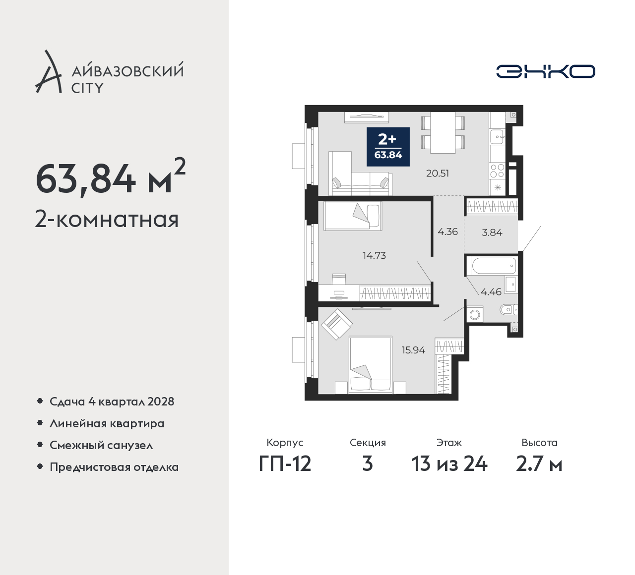 Продается 2-комн. квартира с предчистовой отделкой в ЖК "Айвазовский City" на 13 этаже. Общая площадь: 63.84 кв.м., жилая: 30.67 кв.м., площадь просторной кухни-столовой: 20.51 кв.м. Комнаты изолированные, все окна выходят на одну сторону. В квартире один совмещенный санузел. Высота потолков 2.7 м. Дом монолитный, многоподъездный, высотой 24 этажа. Квартира находится в 3-й секции в корпусе ГП-12. На этаже 6 квартир. В подъезде 1 пассажирский и 1 грузовой лифт. Окончание строительства - 4 квартал 2028 года. Оформление сделки по договору долевого участия. Новый жилой район располагается в живописном месте на берегу Туры в центральной части города. Принципиально новое пространство для жизни в центре современного города для тех, чьи мечты сбываются, кто нацелен на постоянный рост, перемены к лучшему для себя и своих близких. Каждая деталь Айвазовский City вдохновляет и заряжает на новые свершения: авторская архитектура, сбалансированная продуманная инфраструктура, дизайнерские дворы со спортивными и детскими площадками, парковые зоны с фонтанами, водный канал, украшающий центральный прогулочный маршрут района и многое другое. В 2019 года проект стал лауреатом престижной премии Urban Awards 2019 в номинации «Лучший строящийся региональный жилой комплекс бизнес-класса». Главная особенность Айвазовский City - соседство разных архитектурных школ в рамках одного дома. Изысканная классика, выразительная эклектика и оригинальный модерн - жить в одном из таких домов настоящий повод для гордости. Айвазовский City это идеальное сочетание комфорта, технологий и развитой инфраструктуры. Вход в подъезд возможен с улицы и со двора. Отправляясь на работу или за покупками, жители могут выйти с внешней стороны дома, а для прогулки с ребенком – со стороны двора. Экологически чистые материалы и энергосберегающие технологии, качественное освещение общественных зон, видеонаблюдение по всей территории жилого района (в том числе в подъездах, лифтах и в подземном паркинге), закрытые дворы с доступом только для жителей Айвазовский City. Часть домов в Айвазовский City будут оснащены подземным паркингом. Востребованный в нашем климатическом поясе формат хранения автомобилей защитит собственность владельца в любое время года. Аккредитация в банках: ПАО Банк «ВТБ», ОАО «Альфа-Банк», ПАО «Газпромбанк», «Сбербанк России», ПАО АКБ «Абсолют Банк» и других. (AQID02525692)