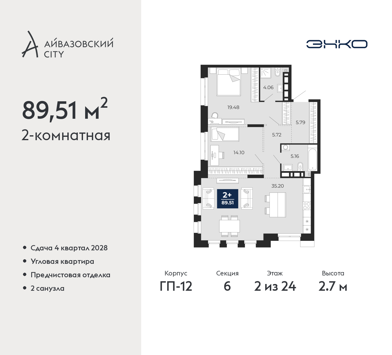 Двухкомнатная квартира с предчистовой отделкой в ЖК "Айвазовский City" на 2 этаже. Общая площадь: 89.51 кв.м., жилая: 33.58 кв.м., площадь просторной кухни-столовой: 35.2 кв.м. Угловая квартира, окна oбecпeчивaют paвнoмepнoe ocвeщeниe в тeчeниe дня. В квартире два совмещенных санузла. Высота потолков 2.7 м. Дом монолитный, многоподъездный, высотой 24 этажа. Квартира находится в 6-й секции в корпусе ГП-12. На этаже 5 квартир. В подъезде 1 пассажирский и 1 грузовой лифт. Окончание строительства - 4 квартал 2028 года. Оформление сделки по договору долевого участия. Новый жилой район располагается в живописном месте на берегу Туры в центральной части города. Принципиально новое пространство для жизни в центре современного города для тех, чьи мечты сбываются, кто нацелен на постоянный рост, перемены к лучшему для себя и своих близких. Каждая деталь Айвазовский City вдохновляет и заряжает на новые свершения: авторская архитектура, сбалансированная продуманная инфраструктура, дизайнерские дворы со спортивными и детскими площадками, парковые зоны с фонтанами, водный канал, украшающий центральный прогулочный маршрут района и многое другое. В 2019 года проект стал лауреатом престижной премии Urban Awards 2019 в номинации «Лучший строящийся региональный жилой комплекс бизнес-класса». Главная особенность Айвазовский City - соседство разных архитектурных школ в рамках одного дома. Изысканная классика, выразительная эклектика и оригинальный модерн - жить в одном из таких домов настоящий повод для гордости. Айвазовский City это идеальное сочетание комфорта, технологий и развитой инфраструктуры. Вход в подъезд возможен с улицы и со двора. Отправляясь на работу или за покупками, жители могут выйти с внешней стороны дома, а для прогулки с ребенком – со стороны двора. Экологически чистые материалы и энергосберегающие технологии, качественное освещение общественных зон, видеонаблюдение по всей территории жилого района (в том числе в подъездах, лифтах и в подземном паркинге), закрытые дворы с доступом только для жителей Айвазовский City. Часть домов в Айвазовский City будут оснащены подземным паркингом. Востребованный в нашем климатическом поясе формат хранения автомобилей защитит собственность владельца в любое время года. Аккредитация в банках: ПАО «Газпромбанк», ПАО Банк «ВТБ», ОАО «Альфа-Банк», «Сбербанк России», ПАО «Совкомбанк» и других. (AQID02525755)
