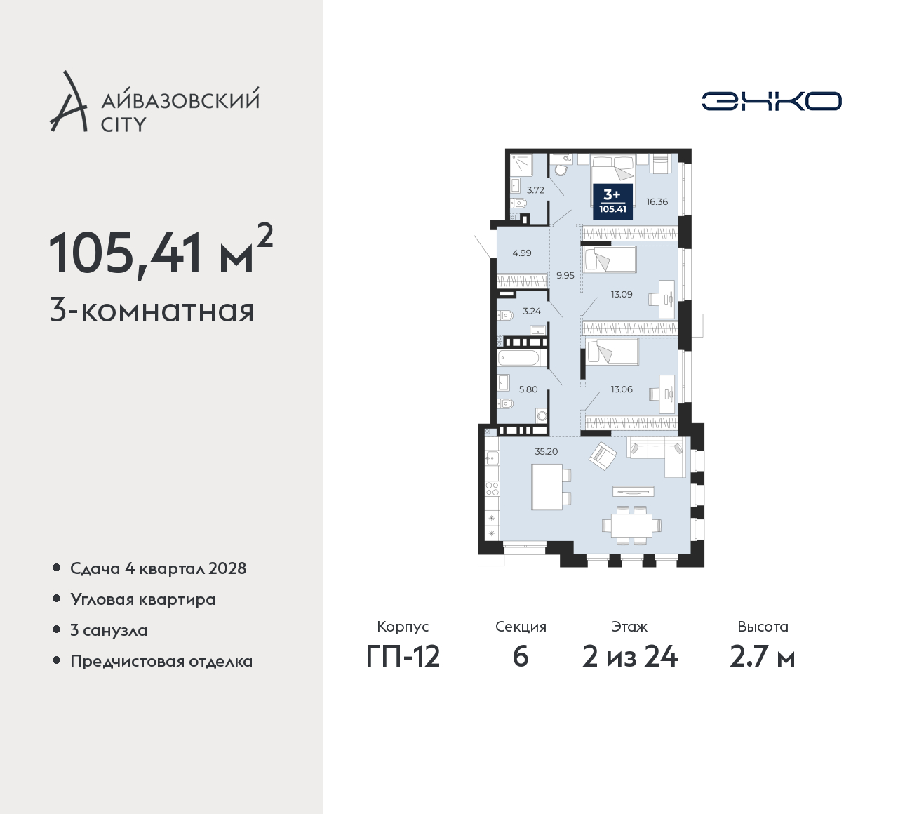 Продается трехкомнатная квартира от застройщика с предчистовой отделкой в ЖК "Айвазовский City" на 2 этаже. Общая площадь: 105.41 кв.м., жилая: 42.51 кв.м., площадь просторной кухни-столовой: 35.2 кв.м. Угловая квартира, окна oбecпeчивaют paвнoмepнoe ocвeщeниe в тeчeниe дня. В квартире два совмещенных и один раздельный санузел. Высота потолков 2.7 м. Дом монолитный, многоподъездный, высотой 24 этажа. Квартира находится в 6-й секции в корпусе ГП-12. На этаже 5 квартир. В подъезде 1 пассажирский и 1 грузовой лифт. Окончание строительства - 4 квартал 2028 года. Оформление сделки по договору долевого участия. Новый жилой район располагается в живописном месте на берегу Туры в центральной части города. Принципиально новое пространство для жизни в центре современного города для тех, чьи мечты сбываются, кто нацелен на постоянный рост, перемены к лучшему для себя и своих близких. Каждая деталь Айвазовский City вдохновляет и заряжает на новые свершения: авторская архитектура, сбалансированная продуманная инфраструктура, дизайнерские дворы со спортивными и детскими площадками, парковые зоны с фонтанами, водный канал, украшающий центральный прогулочный маршрут района и многое другое. В 2019 года проект стал лауреатом престижной премии Urban Awards 2019 в номинации «Лучший строящийся региональный жилой комплекс бизнес-класса». Главная особенность Айвазовский City - соседство разных архитектурных школ в рамках одного дома. Изысканная классика, выразительная эклектика и оригинальный модерн - жить в одном из таких домов настоящий повод для гордости. Айвазовский City это идеальное сочетание комфорта, технологий и развитой инфраструктуры. Вход в подъезд возможен с улицы и со двора. Отправляясь на работу или за покупками, жители могут выйти с внешней стороны дома, а для прогулки с ребенком – со стороны двора. Экологически чистые материалы и энергосберегающие технологии, качественное освещение общественных зон, видеонаблюдение по всей территории жилого района (в том числе в подъездах, лифтах и в подземном паркинге), закрытые дворы с доступом только для жителей Айвазовский City. Часть домов в Айвазовский City будут оснащены подземным паркингом. Востребованный в нашем климатическом поясе формат хранения автомобилей защитит собственность владельца в любое время года. Аккредитация в банках: ОАО «Альфа-Банк», ПАО Банк «ВТБ», «Сбербанк России», ПАО «Газпромбанк», ПАО «Совкомбанк» и других. (AQID02525776)