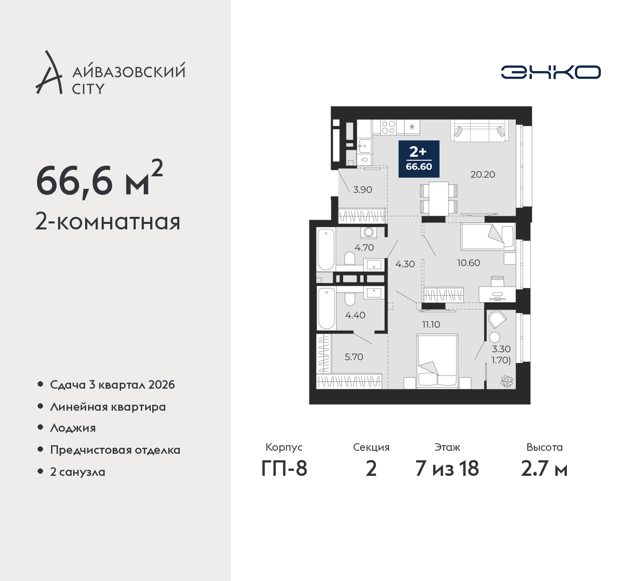 - Общая площадь 66.6 м²