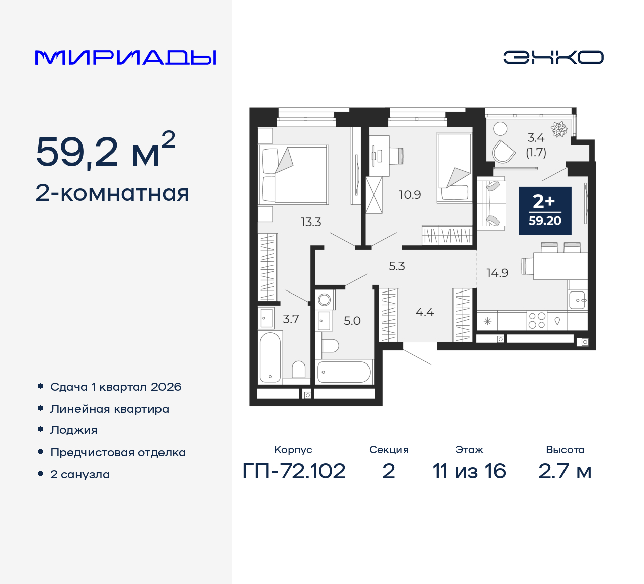 Продается 2-комн. квартира от застройщика с предчистовой отделкой в ЖК "Мириады" на 11 этаже. Общая площадь: 59.2 кв.м., жилая: 24.2 кв.м., площадь просторной кухни-столовой: 14.9 кв.м. Комнаты изолированные, все окна выходят на одну сторону. В квартире одна лоджия, два совмещенных санузла. Высота потолков 2.7 м. Дом монолитный, многоподъездный, переменной этажности, от 14 до 16 этажей. Квартира находится во 2-й секции высотой 16 этажей в корпусе ГП-72.102. На этаже 6 квартир. В подъезде 1 пассажирский и 1 грузовой лифт. Окончание строительства - 1 квартал 2026 года. Оформление сделки по договору долевого участия. Вселенная бесконечных историй. Ранее невиданный Тюмени масштаб: территория 240 гектаров и 1 650 000 м² застройки. Мириады – это город масштабных перемен и больших возможностей. Город зеленых рощ и зеркальных озер. Город для работы, учебы и развлечений. Город для детей и их родителей. Город для всех и каждого. Проект расположен в районе Мыс рядом с ТРЦ «Тюмень Сити Молл» в границах улицы Тимофея Чаркова, Тобольского тракта и объездной дороги. Срок полного освоения территории - до 2034 года. (AQID02527316)