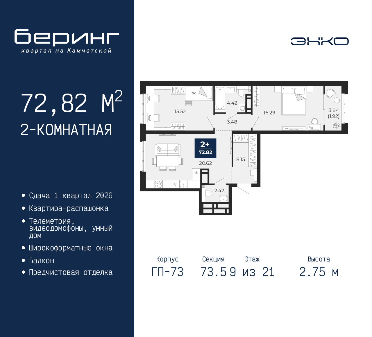 Двухкомнатная квартира с предчистовой отделкой в ЖК "Беринг" на 9 этаже. Общая площадь: 72.82 кв.м., жилая: 31.81 кв.м., площадь просторной кухни-столовой: 20.62 кв.м. Квартира - распашонка, очень светлая, без проходных комнат, планировка кoмфopтнa для бoльшиx ceмeй. В квартире один балкон, один совмещенный и один раздельный санузел. Высота потолков 2.75 м. Дом монолитный, многоподъездный, переменной этажности, от 9 до 22 этажей. Квартира находится в 73.5-й секции высотой 21 этаж в корпусе ГП-73. На этаже 6 квартир. В подъезде 1 пассажирский и 1 грузовой лифт. Окончание строительства - 1 квартал 2026 года. Оформление сделки по договору долевого участия. Подобно знаменитому исследователю, мы чувствуем себя первооткрывателями этой локации. Хотим показать новую суть места, сформировать для вас жизненный опыт, которого ещё не было. Беринг — район зелёного цвета. Беринг — район, который откроется вам с другой стороны. Впечатлит новым уровнем комфорта и качеством жизни. Беринг — открытие на карте города. Первый квартал расположен в районе Тура, в границах улиц: Камчатская – Западносибирская – Энтузиастов. Вокруг уже есть всё для того, чтобы ежедневная рутина была лишь частью жизни и не доставляла дискомфорта. Школы и детские сады, магазины и аптеки, поликлиника, места для семейного отдыха, пеших и велопрогулок, и даже рыбалки. Масштабное озеленение дворов — визитная карточка ЭНКО и ваш оазис спокойствия, чтобы отвлечься от повседневности. Раскидистые деревья, кустарники, травы и цветы — осталось остановиться, вдохнуть и расслабиться, глядя на эту природную красоту. Стилистика подъездов продолжает концепцию Беринга, вдохновлённого Камчаткой: сдержанный, но при этом впечатляющий дизайн соседствует с удобством и функциональностью. (AQID02527848)