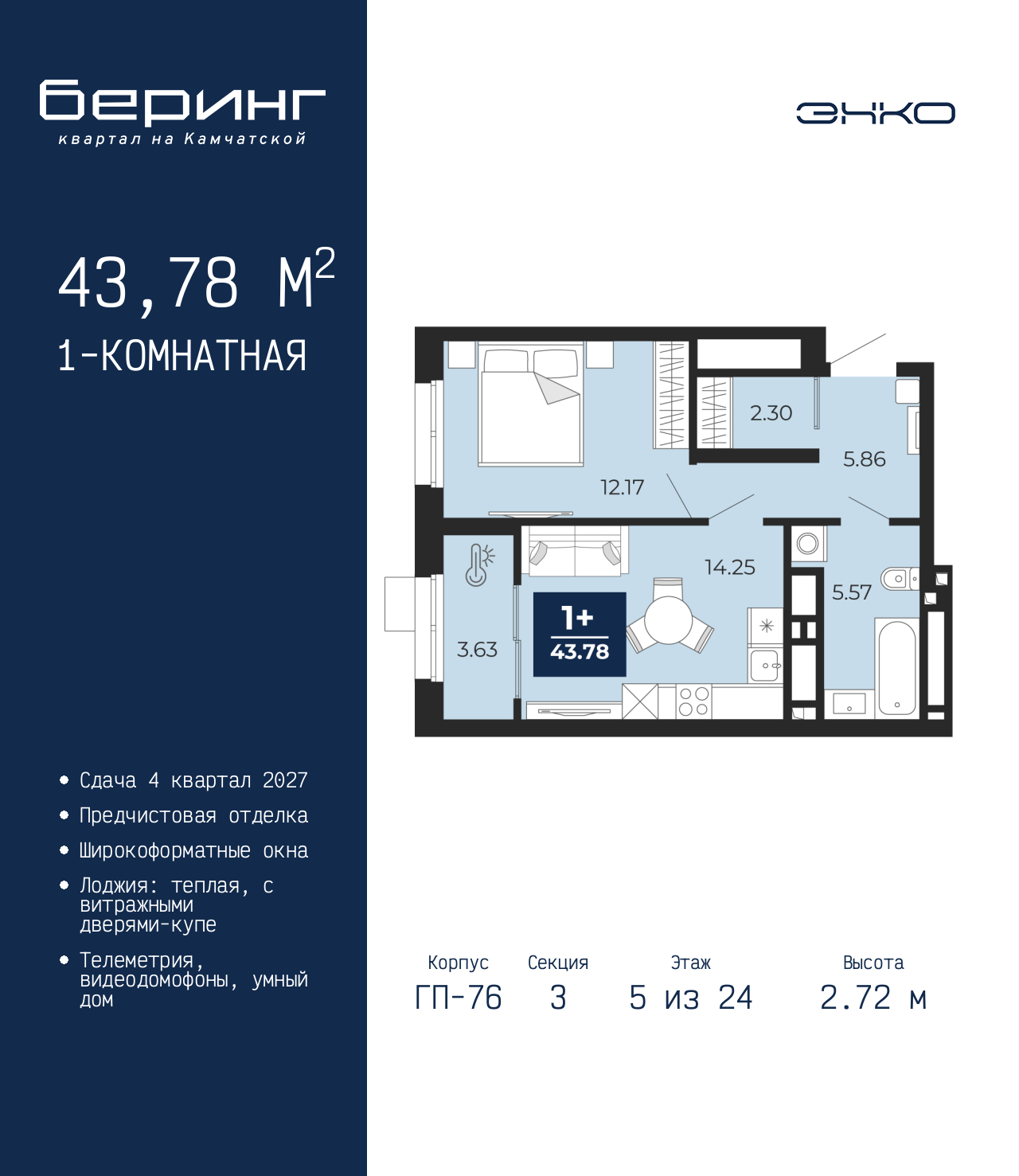 Просторная 1-комн. квартира с предчистовой отделкой в ЖК "Беринг" на 5 этаже. Общая площадь: 43.78 кв.м., жилая: 12.17 кв.м., площадь просторной кухни-столовой: 14.25 кв.м. Все окна выходят на одну сторону. В квартире одна лоджия, один совмещенный санузел. Высота потолков 2.72 м. Дом монолитный, черырехподъездный, переменной этажности, от 19 до 24 этажей. Квартира находится в 3-й секции высотой 24 этажа в корпусе ГП-76. На этаже 6 квартир. В подъезде 1 пассажирский и 1 грузовой лифт. Окончание строительства - 4 квартал 2027 года. Оформление сделки по договору долевого участия. Подобно знаменитому исследователю, мы чувствуем себя первооткрывателями этой локации. Хотим показать новую суть места, сформировать для вас жизненный опыт, которого ещё не было. Беринг — район зелёного цвета. Беринг — район, который откроется вам с другой стороны. Впечатлит новым уровнем комфорта и качеством жизни. Беринг — открытие на карте города. Первый квартал расположен в районе Тура, в границах улиц: Камчатская – Западносибирская – Энтузиастов. Вокруг уже есть всё для того, чтобы ежедневная рутина была лишь частью жизни и не доставляла дискомфорта. Школы и детские сады, магазины и аптеки, поликлиника, места для семейного отдыха, пеших и велопрогулок, и даже рыбалки. Масштабное озеленение дворов — визитная карточка ЭНКО и ваш оазис спокойствия, чтобы отвлечься от повседневности. Раскидистые деревья, кустарники, травы и цветы — осталось остановиться, вдохнуть и расслабиться, глядя на эту природную красоту. Стилистика подъездов продолжает концепцию Беринга, вдохновлённого Камчаткой: сдержанный, но при этом впечатляющий дизайн соседствует с удобством и функциональностью. (AQID02529241)