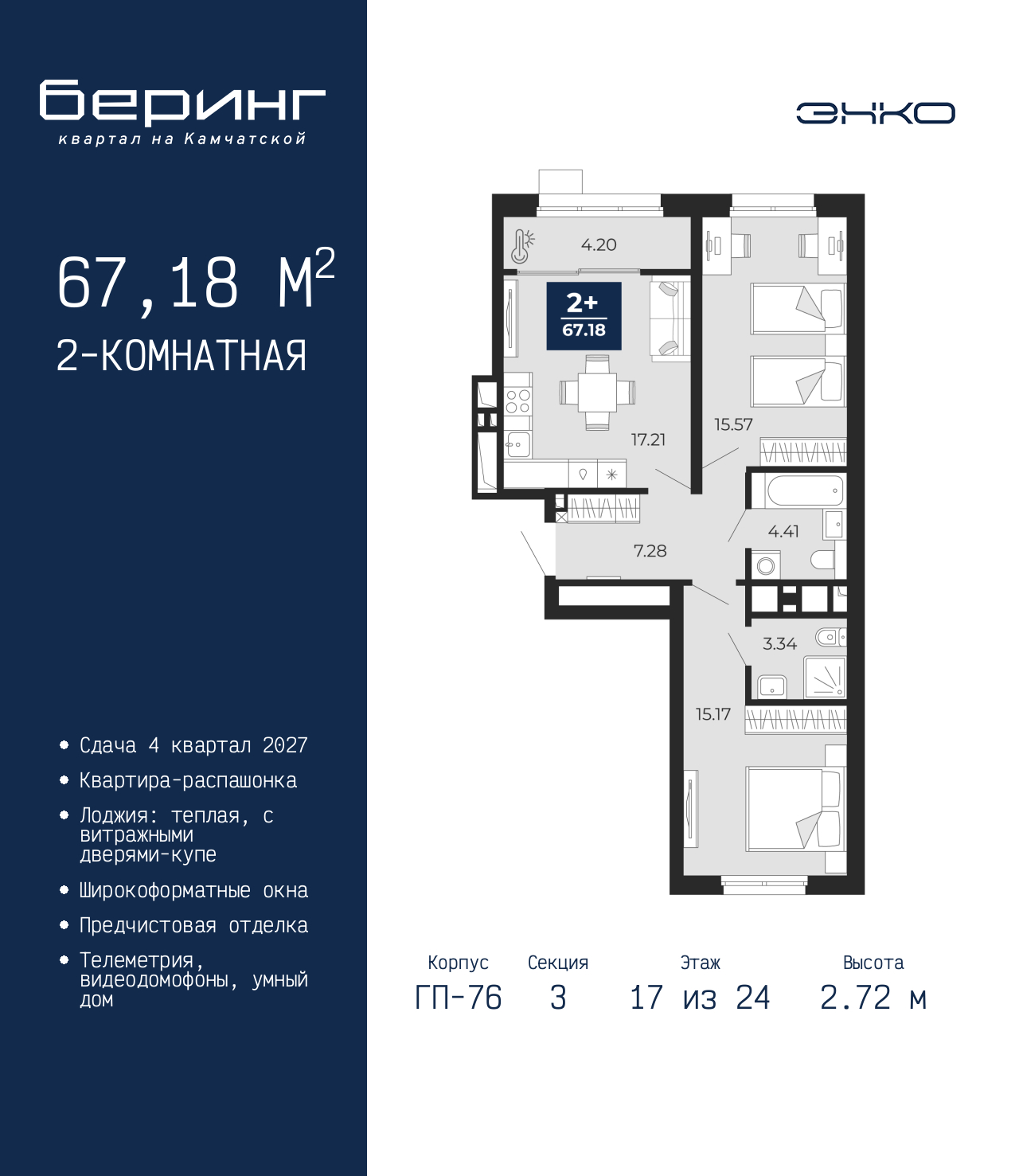 Просторная 2-комн. квартира с предчистовой отделкой в ЖК "Беринг" на 17 этаже. Общая площадь: 67.18 кв.м., жилая: 30.74 кв.м., площадь просторной кухни-столовой: 17.21 кв.м. Квартира - распашонка, без проходных комнат, окна выходят на paзные стороны дома. В квартире одна лоджия, два совмещенных санузла. Высота потолков 2.72 м. Дом монолитный, черырехподъездный, переменной этажности, от 19 до 24 этажей. Квартира находится в 3-й секции высотой 24 этажа в корпусе ГП-76. На этаже 6 квартир. В подъезде 1 пассажирский и 1 грузовой лифт. Окончание строительства - 4 квартал 2027 года. Оформление сделки по договору долевого участия. Подобно знаменитому исследователю, мы чувствуем себя первооткрывателями этой локации. Хотим показать новую суть места, сформировать для вас жизненный опыт, которого ещё не было. Беринг — район зелёного цвета. Беринг — район, который откроется вам с другой стороны. Впечатлит новым уровнем комфорта и качеством жизни. Беринг — открытие на карте города. Первый квартал расположен в районе Тура, в границах улиц: Камчатская – Западносибирская – Энтузиастов. Вокруг уже есть всё для того, чтобы ежедневная рутина была лишь частью жизни и не доставляла дискомфорта. Школы и детские сады, магазины и аптеки, поликлиника, места для семейного отдыха, пеших и велопрогулок, и даже рыбалки. Масштабное озеленение дворов — визитная карточка ЭНКО и ваш оазис спокойствия, чтобы отвлечься от повседневности. Раскидистые деревья, кустарники, травы и цветы — осталось остановиться, вдохнуть и расслабиться, глядя на эту природную красоту. Стилистика подъездов продолжает концепцию Беринга, вдохновлённого Камчаткой: сдержанный, но при этом впечатляющий дизайн соседствует с удобством и функциональностью. (AQID02529325)