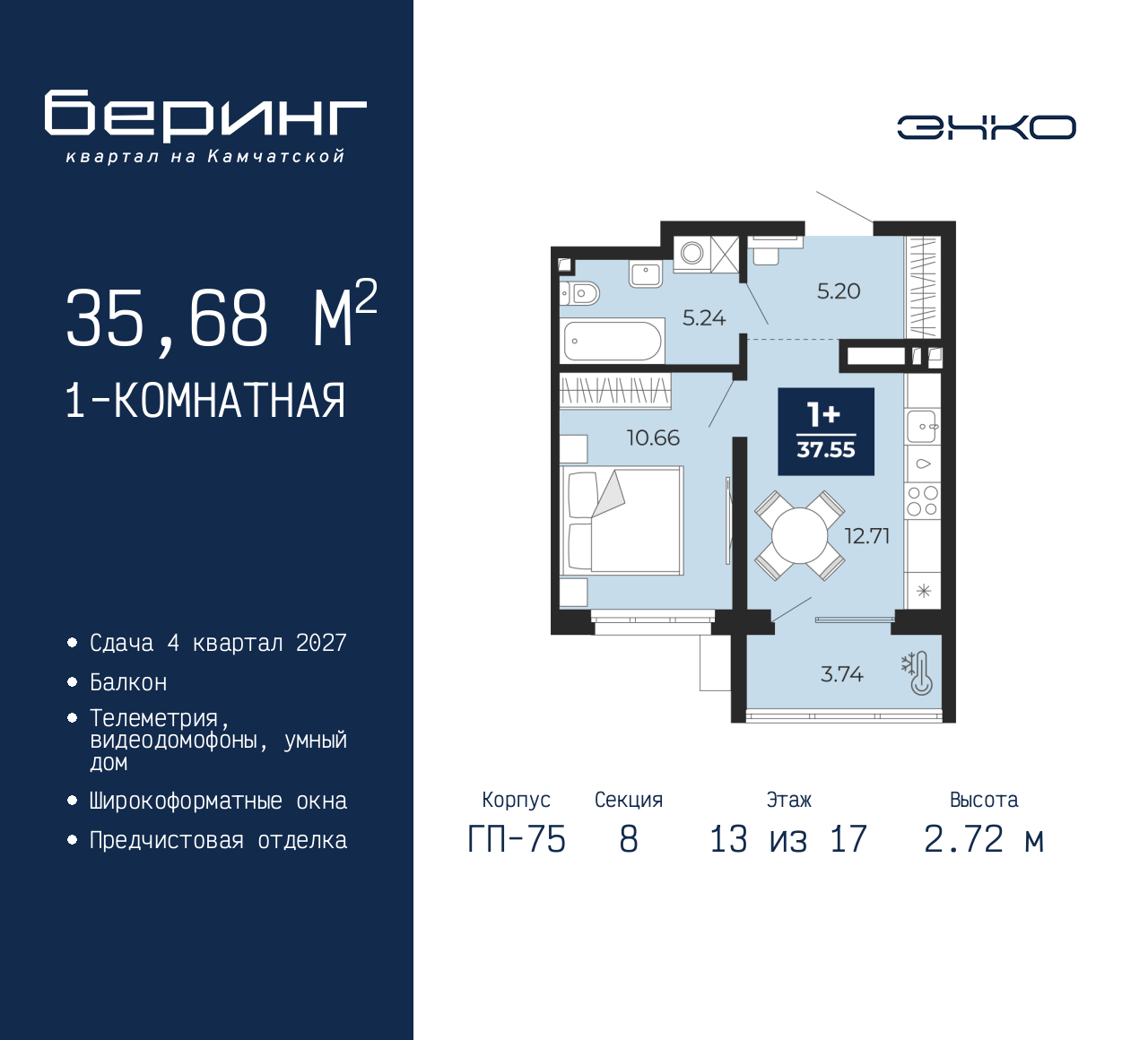 Просторная 1-комн. квартира с предчистовой отделкой в ЖК "Беринг" на 13 этаже. Общая площадь: 35.68 кв.м., жилая: 10.66 кв.м., площадь просторной кухни-столовой: 12.71 кв.м. Все окна выходят на одну сторону. В квартире один балкон, один совмещенный санузел. Высота потолков 2.72 м. Дом монолитный, многоподъездный, переменной этажности, от 17 до 24 этажей. Квартира находится в 8-й секции высотой 17 этажей в корпусе ГП-75. На этаже 8 квартир. В подъезде 2 пассажирских и 1 грузовой лифт. Окончание строительства - 4 квартал 2027 года. Оформление сделки по договору долевого участия. Подобно знаменитому исследователю, мы чувствуем себя первооткрывателями этой локации. Хотим показать новую суть места, сформировать для вас жизненный опыт, которого ещё не было. Беринг — район зелёного цвета. Беринг — район, который откроется вам с другой стороны. Впечатлит новым уровнем комфорта и качеством жизни. Беринг — открытие на карте города. Первый квартал расположен в районе Тура, в границах улиц: Камчатская – Западносибирская – Энтузиастов. Вокруг уже есть всё для того, чтобы ежедневная рутина была лишь частью жизни и не доставляла дискомфорта. Школы и детские сады, магазины и аптеки, поликлиника, места для семейного отдыха, пеших и велопрогулок, и даже рыбалки. Масштабное озеленение дворов — визитная карточка ЭНКО и ваш оазис спокойствия, чтобы отвлечься от повседневности. Раскидистые деревья, кустарники, травы и цветы — осталось остановиться, вдохнуть и расслабиться, глядя на эту природную красоту. Стилистика подъездов продолжает концепцию Беринга, вдохновлённого Камчаткой: сдержанный, но при этом впечатляющий дизайн соседствует с удобством и функциональностью. (AQID02529556)