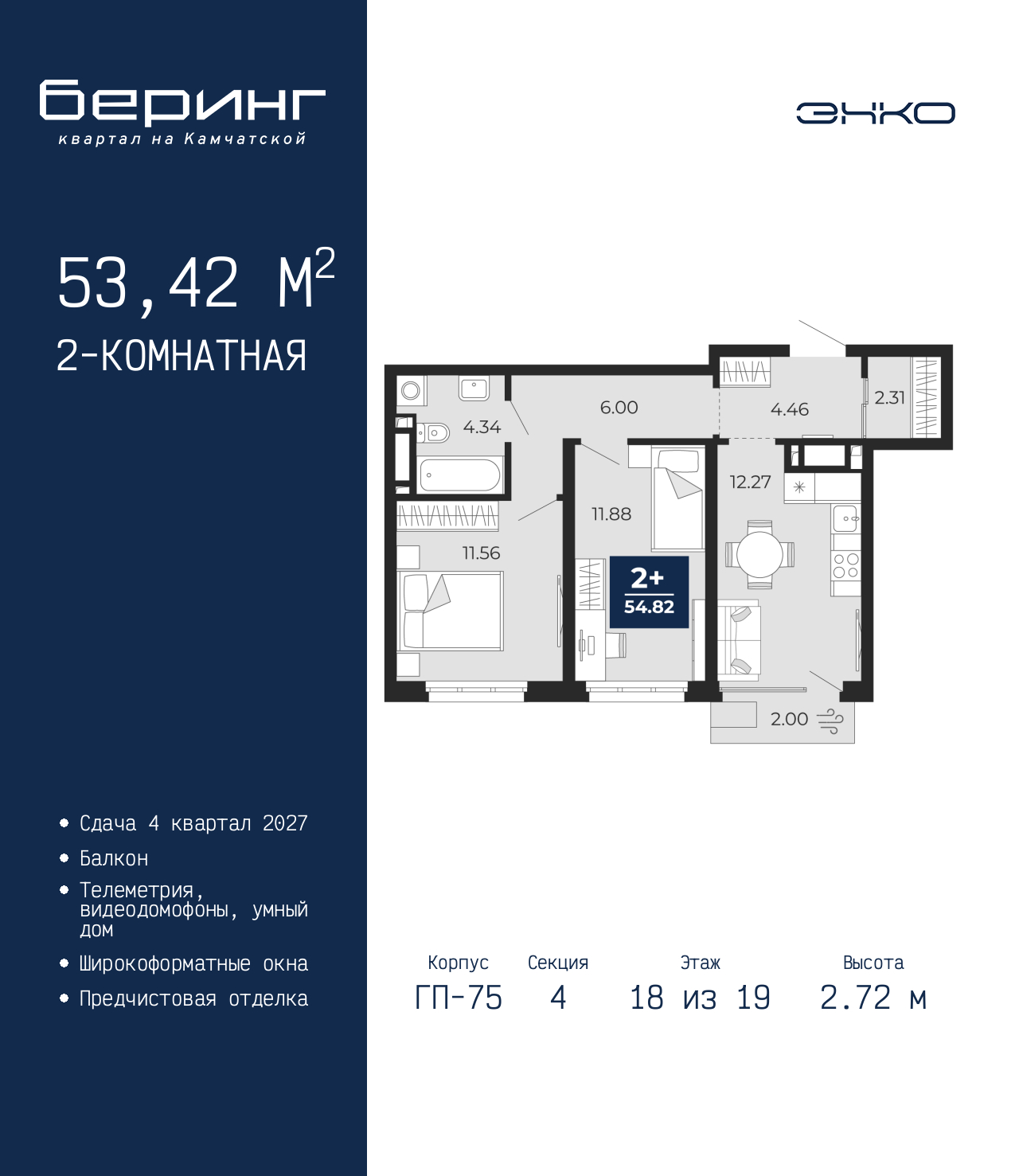 Просторная 2-комн. квартира с предчистовой отделкой в ЖК "Беринг" на 18 этаже. Общая площадь: 53.42 кв.м., жилая: 23.44 кв.м., площадь просторной кухни-столовой: 12.27 кв.м. Комнаты изолированные, все окна выходят на одну сторону. В квартире один балкон, один совмещенный санузел. Высота потолков 2.72 м. Дом монолитный, многоподъездный, переменной этажности, от 17 до 24 этажей. Квартира находится в 4-й секции высотой 19 этажей в корпусе ГП-75. На этаже 4 квартиры. В подъезде 2 пассажирских и 1 грузовой лифт. Окончание строительства - 4 квартал 2027 года. Оформление сделки по договору долевого участия. Подобно знаменитому исследователю, мы чувствуем себя первооткрывателями этой локации. Хотим показать новую суть места, сформировать для вас жизненный опыт, которого ещё не было. Беринг — район зелёного цвета. Беринг — район, который откроется вам с другой стороны. Впечатлит новым уровнем комфорта и качеством жизни. Беринг — открытие на карте города. Первый квартал расположен в районе Тура, в границах улиц: Камчатская – Западносибирская – Энтузиастов. Вокруг уже есть всё для того, чтобы ежедневная рутина была лишь частью жизни и не доставляла дискомфорта. Школы и детские сады, магазины и аптеки, поликлиника, места для семейного отдыха, пеших и велопрогулок, и даже рыбалки. Масштабное озеленение дворов — визитная карточка ЭНКО и ваш оазис спокойствия, чтобы отвлечься от повседневности. Раскидистые деревья, кустарники, травы и цветы — осталось остановиться, вдохнуть и расслабиться, глядя на эту природную красоту. Стилистика подъездов продолжает концепцию Беринга, вдохновлённого Камчаткой: сдержанный, но при этом впечатляющий дизайн соседствует с удобством и функциональностью. (AQID02529675)