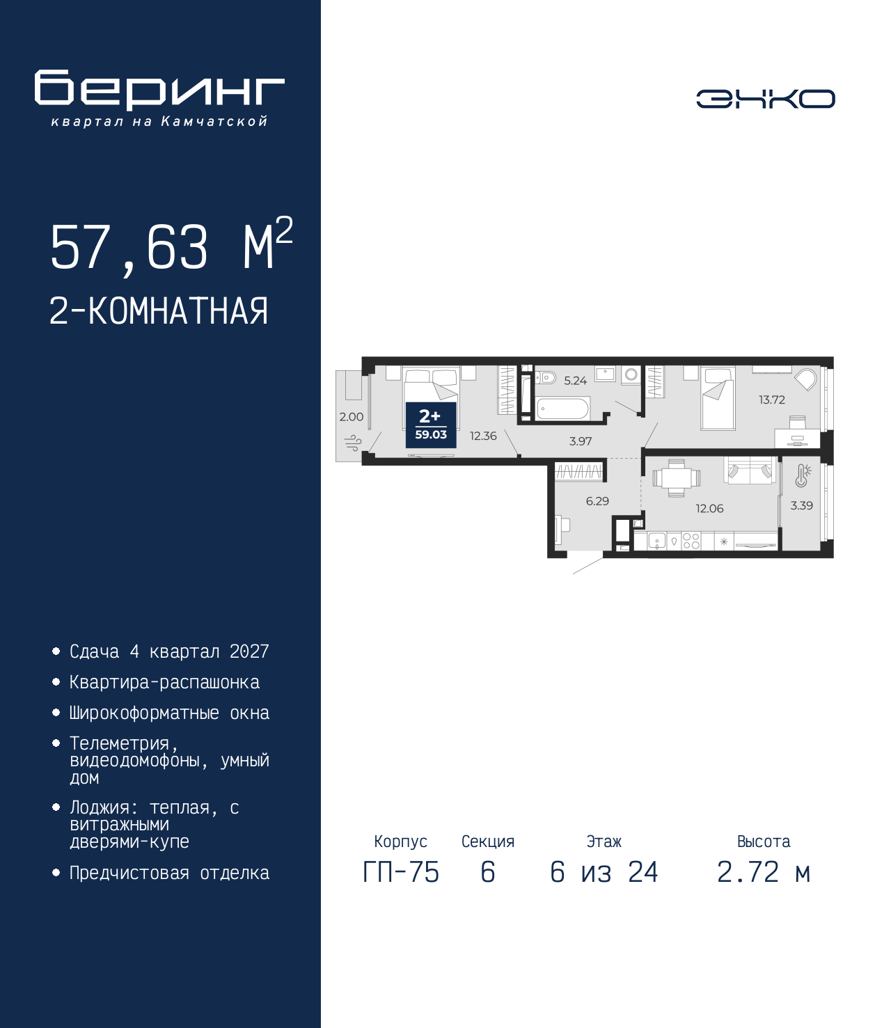 - Общая площадь 57.63 м²