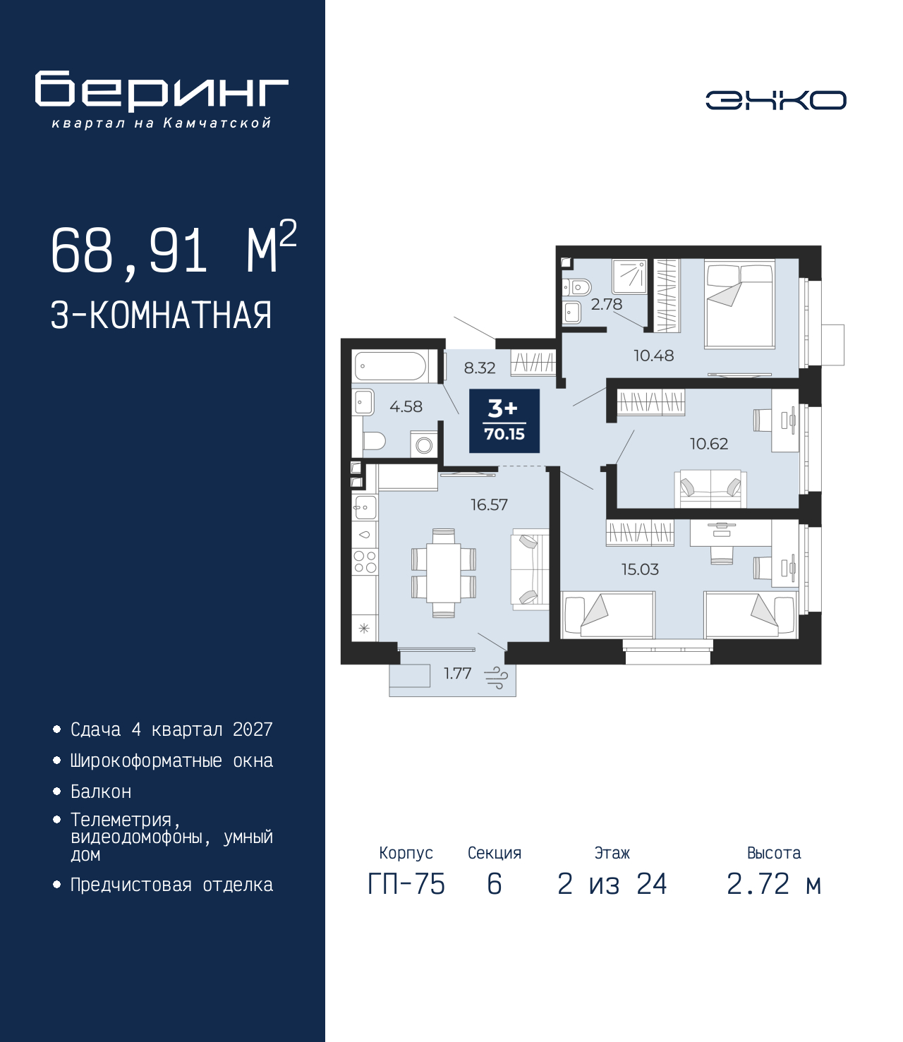 - Общая площадь 68.91 м²