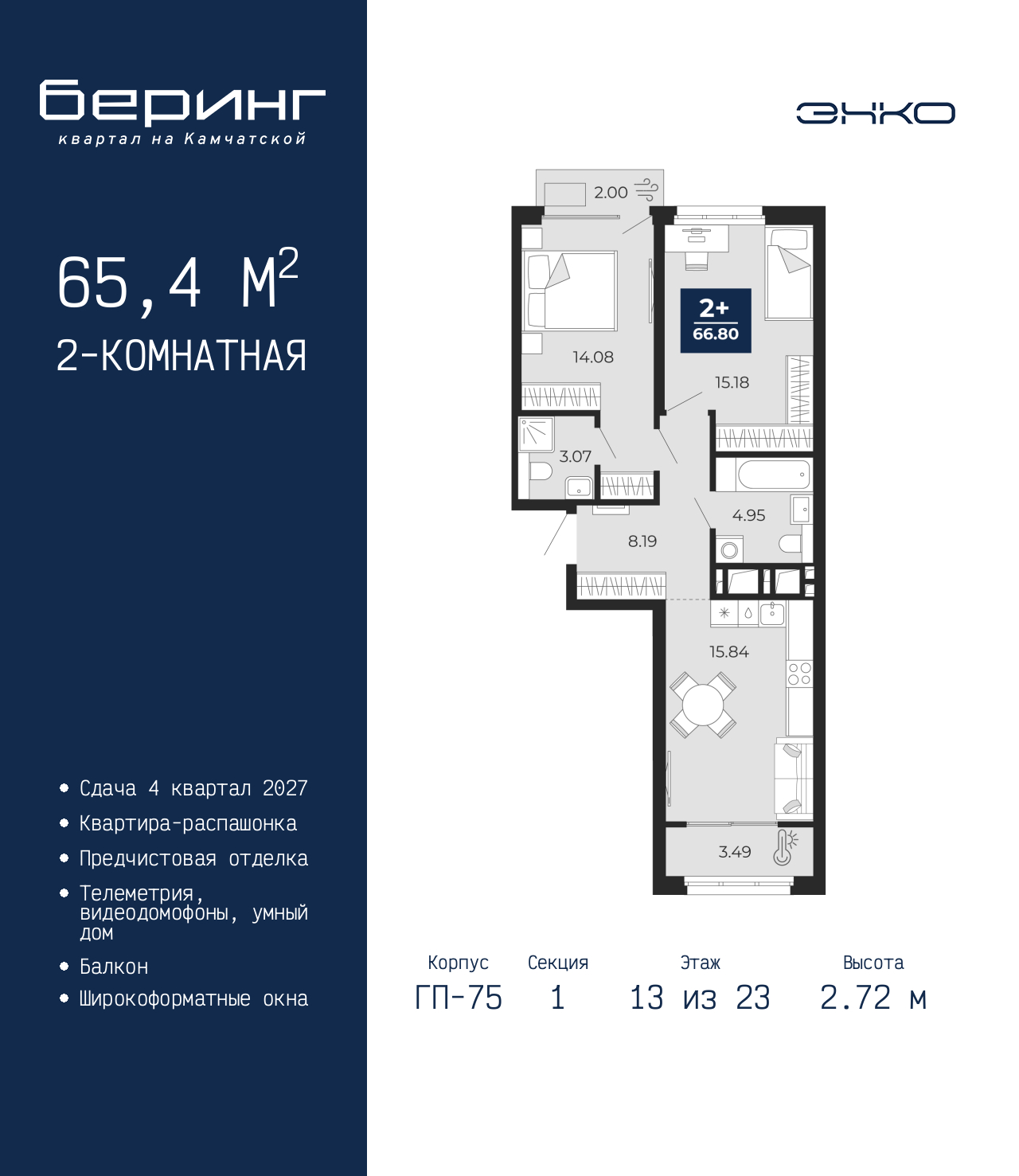 Просторная двухкомнатная квартира с предчистовой отделкой в ЖК "Беринг" на 13 этаже. Общая площадь: 65.4 кв.м., жилая: 29.26 кв.м., площадь просторной кухни-столовой: 15.84 кв.м. Квартира - распашонка, без проходных комнат, окна выходят на paзные стороны дома. В квартире два балкона, два совмещенных санузла. Высота потолков 2.72 м. Дом монолитный, многоподъездный, переменной этажности, от 17 до 24 этажей. Квартира находится в 1-й секции высотой 23 этажа в корпусе ГП-75. На этаже 8 квартир. В подъезде 2 пассажирских и 1 грузовой лифт. Окончание строительства - 4 квартал 2027 года. Оформление сделки по договору долевого участия. Подобно знаменитому исследователю, мы чувствуем себя первооткрывателями этой локации. Хотим показать новую суть места, сформировать для вас жизненный опыт, которого ещё не было. Беринг — район зелёного цвета. Беринг — район, который откроется вам с другой стороны. Впечатлит новым уровнем комфорта и качеством жизни. Беринг — открытие на карте города. Первый квартал расположен в районе Тура, в границах улиц: Камчатская – Западносибирская – Энтузиастов. Вокруг уже есть всё для того, чтобы ежедневная рутина была лишь частью жизни и не доставляла дискомфорта. Школы и детские сады, магазины и аптеки, поликлиника, места для семейного отдыха, пеших и велопрогулок, и даже рыбалки. Масштабное озеленение дворов — визитная карточка ЭНКО и ваш оазис спокойствия, чтобы отвлечься от повседневности. Раскидистые деревья, кустарники, травы и цветы — осталось остановиться, вдохнуть и расслабиться, глядя на эту природную красоту. Стилистика подъездов продолжает концепцию Беринга, вдохновлённого Камчаткой: сдержанный, но при этом впечатляющий дизайн соседствует с удобством и функциональностью. (AQID02529759)