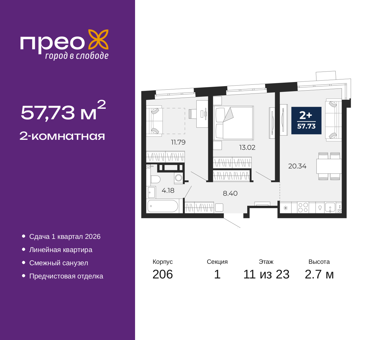 - Общая площадь 57.73 м²