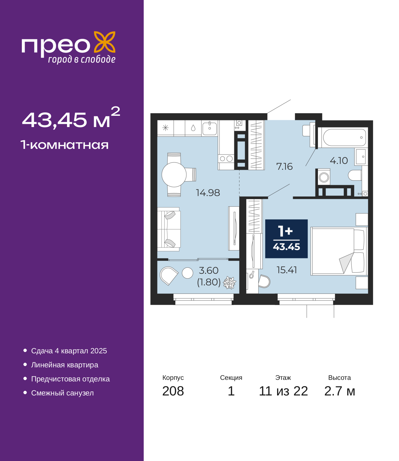 1-комн. квартира от застройщика с предчистовой отделкой в ЖК "Прео" на 11 этаже. Общая площадь: 43.45 кв.м., жилая: 15.41 кв.м., площадь просторной кухни-столовой: 14.98 кв.м. Все окна выходят на одну сторону. В квартире один совмещенный санузел. Высота потолков 2.7 м. Дом монолитный, трехподъездный, переменной этажности, от 14 до 22 этажей. Квартира находится в 1-й секции высотой 22 этажа в корпусе 208. На этаже 8 квартир. В подъезде 1 пассажирский и 1 грузовой лифт. Окончание строительства - 1 квартал 2026 года. Оформление сделки по договору долевого участия. Преображенский — один из самых привлекательных районов для жизни! Это полностью самостоятельный жилой район с точки зрения инфраструктуры. Преображенский находится между Московским и Червишевским трактами в квартале улиц Закалужская — Вьюжная — Александра Протозанова. Не нужно ждать, когда появится инфраструктура — переезжайте на всё готовое. Вблизи расположены действующие школа и детский сад. В этом году откроется еще один сад, а в следующем году — школа. По соседству с Преображенским запланировано строительство городского парка «Комарово» площадью 38 гектар. За 10 минут можно доехать на автомобиле до крупных ТРЦ: «Лента», «Кристалл», «Леруа Мерлен», «Метро» и «Ашан». С 2018 года в районе открыт Соседский центр — пространство, созданное для формирования добрососедской среды, совместного досуга, общения и реализации соседских инициатив. Здесь проходят встречи соседей, а также сами жители района организовывают мероприятия. Организатором такого события может стать любой желающий. В квартирах выполнена качественная предчистовая отделка. Гладкие стены с финишным выравниванием по маякам. Ровный потолок для установки натяжного потолка. Установлены пятикамерные окна с двойным стеклопакетом (3 стекла). Дизайнерские холлы с видеонаблюдением, безбарьерным и прозрачным входом – всегда светло и спокойно. На первом этаже есть просторные колясочные, где все жители могут оставлять свои коляски и велосипеды. В Преображенском есть всё, что нужно для активного отдыха и занятий спортом. Мы сделали большое футбольное поле с безопасным покрытием. Также установили хоккейный корт, который оборудован по всем необходимым стандартам. Во дворах можно делать упражнения на специальных площадках с турниками. Весь район мы обустроили велодорожками, которые связаны в единый маршрут. У нас есть сухие фонтаны, бьющие из земли, деревья, веревки, сетки, скалодром, газон, песок и резинка — осталось просто дать своему ребенку право на свободную игру. По-настоящему хорошие дворы — это те, которые дети предпочитают соцсетям и телевизору. (AQID02532104)