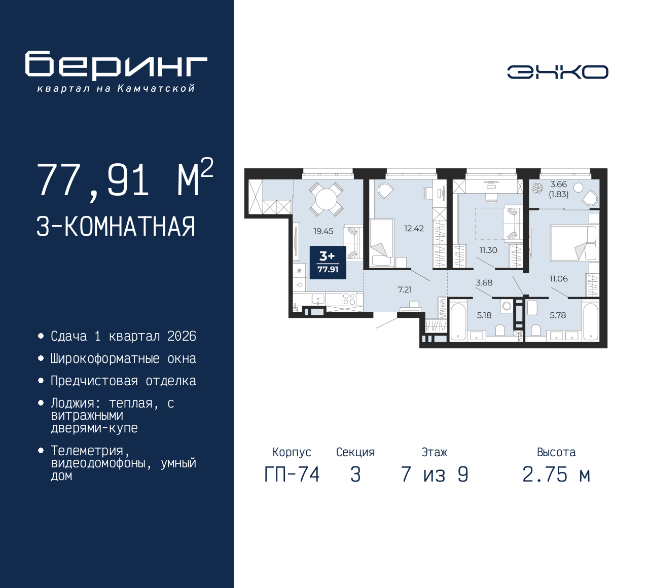 3-комн. квартира от застройщика с предчистовой отделкой в ЖК "Беринг" на 7 этаже. Общая площадь: 77.91 кв.м., жилая: 34.78 кв.м., площадь просторной кухни-столовой: 19.45 кв.м. Комнаты изолированные, все окна выходят на одну сторону. В квартире одна лоджия, два совмещенных санузла. Высота потолков 2.75 м. Дом монолитный, многоподъездный, переменной этажности, от 9 до 21 этажей. Квартира находится в 3-й секции высотой 9 этажей в корпусе ГП-74. На этаже 7 квартир. В подъезде 1 грузовой лифт. Окончание строительства - 1 квартал 2026 года. Оформление сделки по договору долевого участия. Подобно знаменитому исследователю, мы чувствуем себя первооткрывателями этой локации. Хотим показать новую суть места, сформировать для вас жизненный опыт, которого ещё не было. Беринг — район зелёного цвета. Беринг — район, который откроется вам с другой стороны. Впечатлит новым уровнем комфорта и качеством жизни. Беринг — открытие на карте города. Первый квартал расположен в районе Тура, в границах улиц: Камчатская – Западносибирская – Энтузиастов. Вокруг уже есть всё для того, чтобы ежедневная рутина была лишь частью жизни и не доставляла дискомфорта. Школы и детские сады, магазины и аптеки, поликлиника, места для семейного отдыха, пеших и велопрогулок, и даже рыбалки. Масштабное озеленение дворов — визитная карточка ЭНКО и ваш оазис спокойствия, чтобы отвлечься от повседневности. Раскидистые деревья, кустарники, травы и цветы — осталось остановиться, вдохнуть и расслабиться, глядя на эту природную красоту. Стилистика подъездов продолжает концепцию Беринга, вдохновлённого Камчаткой: сдержанный, но при этом впечатляющий дизайн соседствует с удобством и функциональностью. (AQID02532384)
