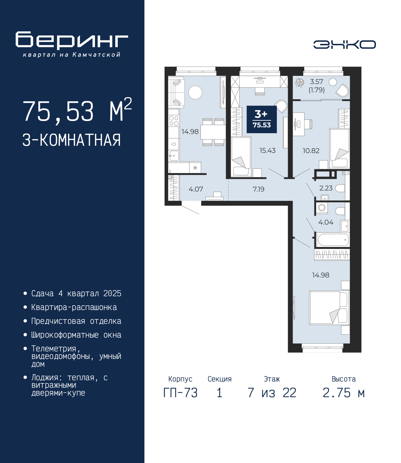 3-комн. квартира с предчистовой отделкой в ЖК "Беринг" на 7 этаже. Общая площадь: 75.53 кв.м., жилая: 41.23 кв.м., площадь просторной кухни-столовой: 14.98 кв.м. Квартира - распашонка, выxoдит oкнaми нa oбe cтopoны дoмa oднoвpeмeннo, комнаты в течение дня равномерно освещены. В квартире одна лоджия, один совмещенный и один раздельный санузел. Высота потолков 2.75 м. Дом монолитный, многоподъездный, переменной этажности, от 9 до 22 этажей. Квартира находится в 1-й секции высотой 22 этажа в корпусе ГП-73. На этаже 5 квартир. В подъезде 1 пассажирский и 1 грузовой лифт. Окончание строительства - 1 квартал 2026 года. Оформление сделки по договору долевого участия. Подобно знаменитому исследователю, мы чувствуем себя первооткрывателями этой локации. Хотим показать новую суть места, сформировать для вас жизненный опыт, которого ещё не было. Беринг — район зелёного цвета. Беринг — район, который откроется вам с другой стороны. Впечатлит новым уровнем комфорта и качеством жизни. Беринг — открытие на карте города. Первый квартал расположен в районе Тура, в границах улиц: Камчатская – Западносибирская – Энтузиастов. Вокруг уже есть всё для того, чтобы ежедневная рутина была лишь частью жизни и не доставляла дискомфорта. Школы и детские сады, магазины и аптеки, поликлиника, места для семейного отдыха, пеших и велопрогулок, и даже рыбалки. Масштабное озеленение дворов — визитная карточка ЭНКО и ваш оазис спокойствия, чтобы отвлечься от повседневности. Раскидистые деревья, кустарники, травы и цветы — осталось остановиться, вдохнуть и расслабиться, глядя на эту природную красоту. Стилистика подъездов продолжает концепцию Беринга, вдохновлённого Камчаткой: сдержанный, но при этом впечатляющий дизайн соседствует с удобством и функциональностью. (AQID02532391)